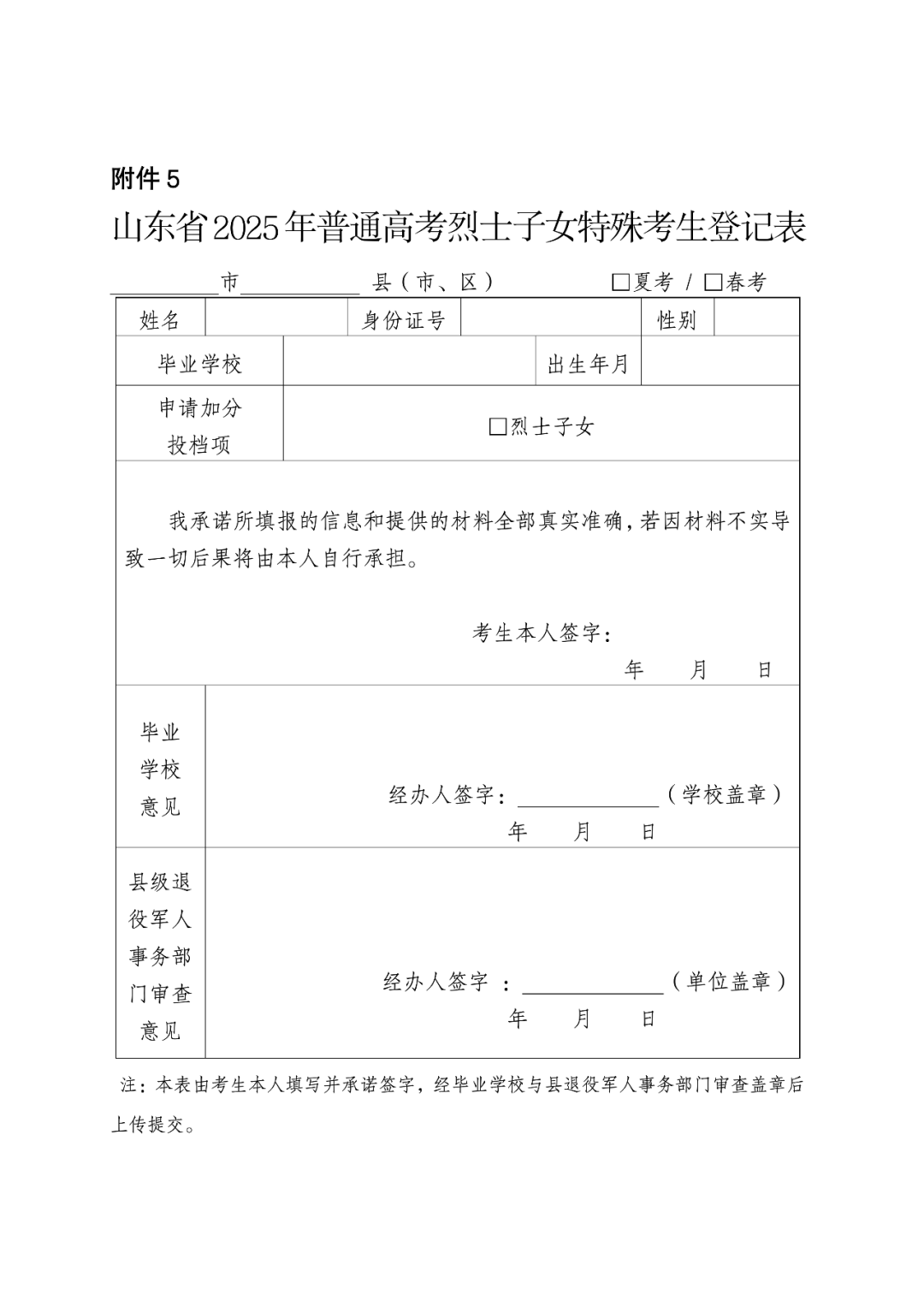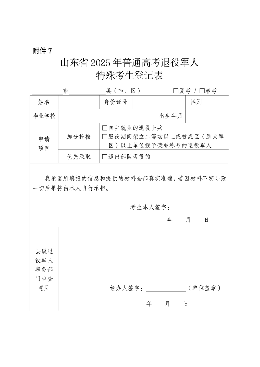 相关考生应填写《山东省2025年普通高考退役军人特殊考生登记表》(以下简称《退役军人登记表》),并经县级退役军人事务部门审核盖章。在网上填报信息时应上传《退役军人登记表》、退役证、自主就业证明或立功证明。