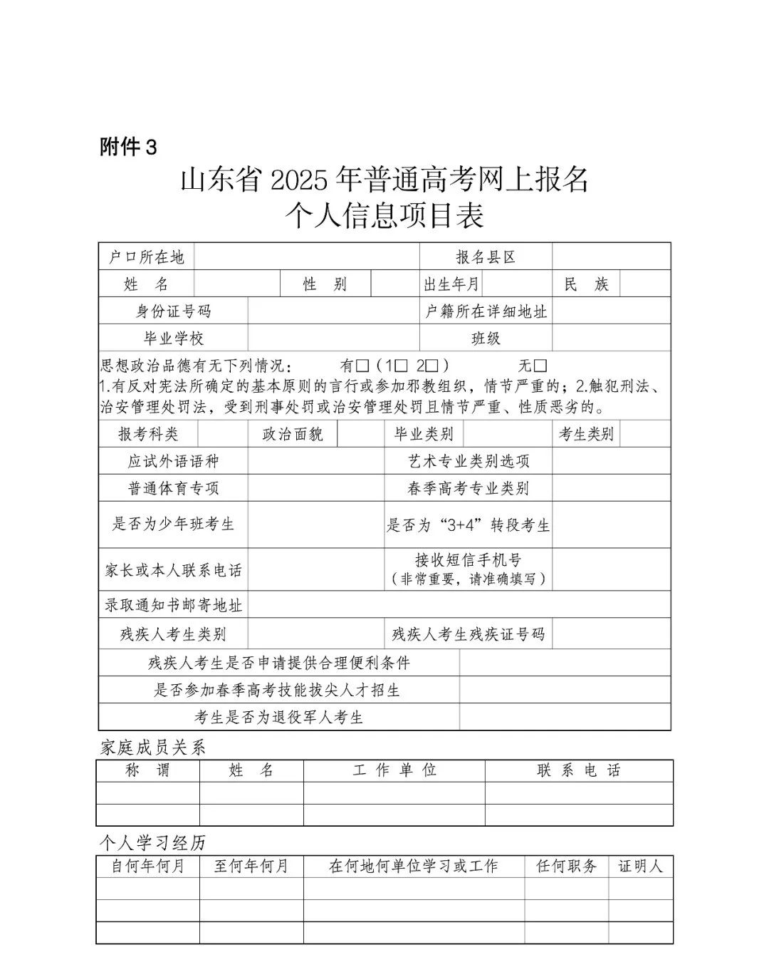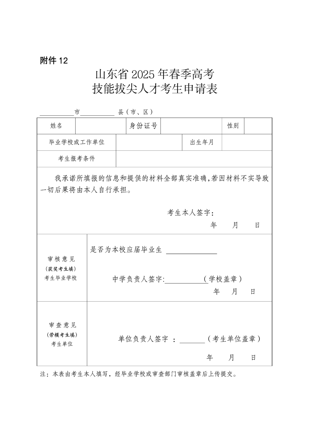 选择参加技能拔尖人才招生的考生须填写《山东省2025年春季高考技能拔尖人才考生申请表》(以下简称《技能拔尖人才申请表》),并经所在单位或毕业学校审查盖章。考生在网上填报信息时须上传相关证明材料。