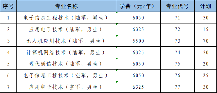 自2014年开展定向培养军士工作来,学校已为陆军、空军、战略支援部队和消防救援队伍培养入伍军士4300余名。在校军士生涉及电子信息工程技术、应用电子技术、计算机网络技术、现代通信技术、无人机应用技术等5个专业,学校定向军士年度招生计划、在校生规模和人才培养质量均位居全国同类院校前列。