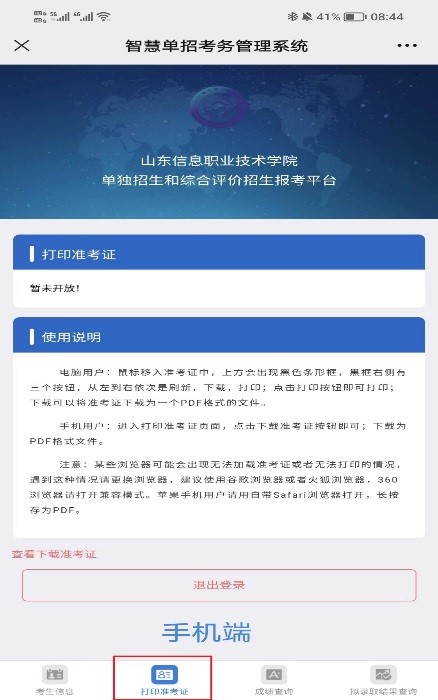 注:未交费考生需先登陆山东信息职业技术学院单招和综评报考系统交费后,方可打印准考证。具体操作流程详见缴费指南(https://zhaosheng.sdcit.edu.cn/zsdt/25219.jhtml)