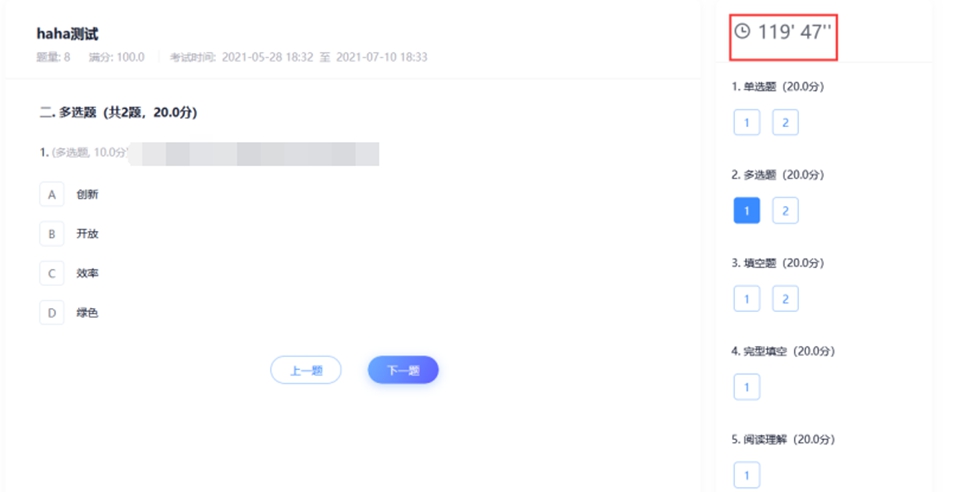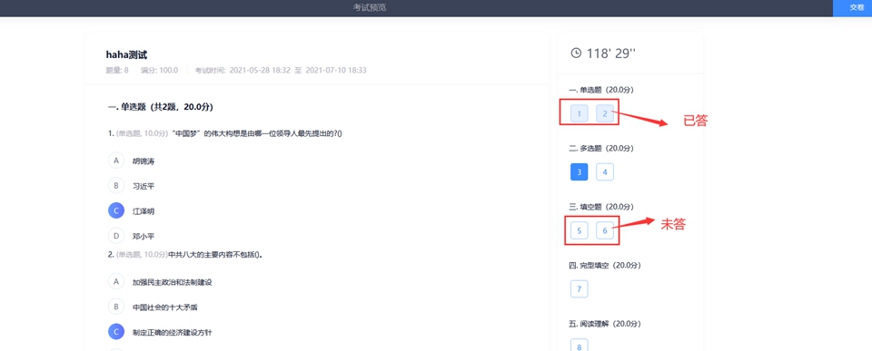 (9)右上方显示考试限时及倒计时,请在限时之内完成并提交,否则系统将自动提交答卷。