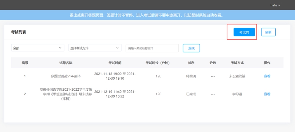 进入考试。单击开始考试按钮,在手机端学习通APP行直播账号登录并开启直播调整机位,否则无法开始考试。