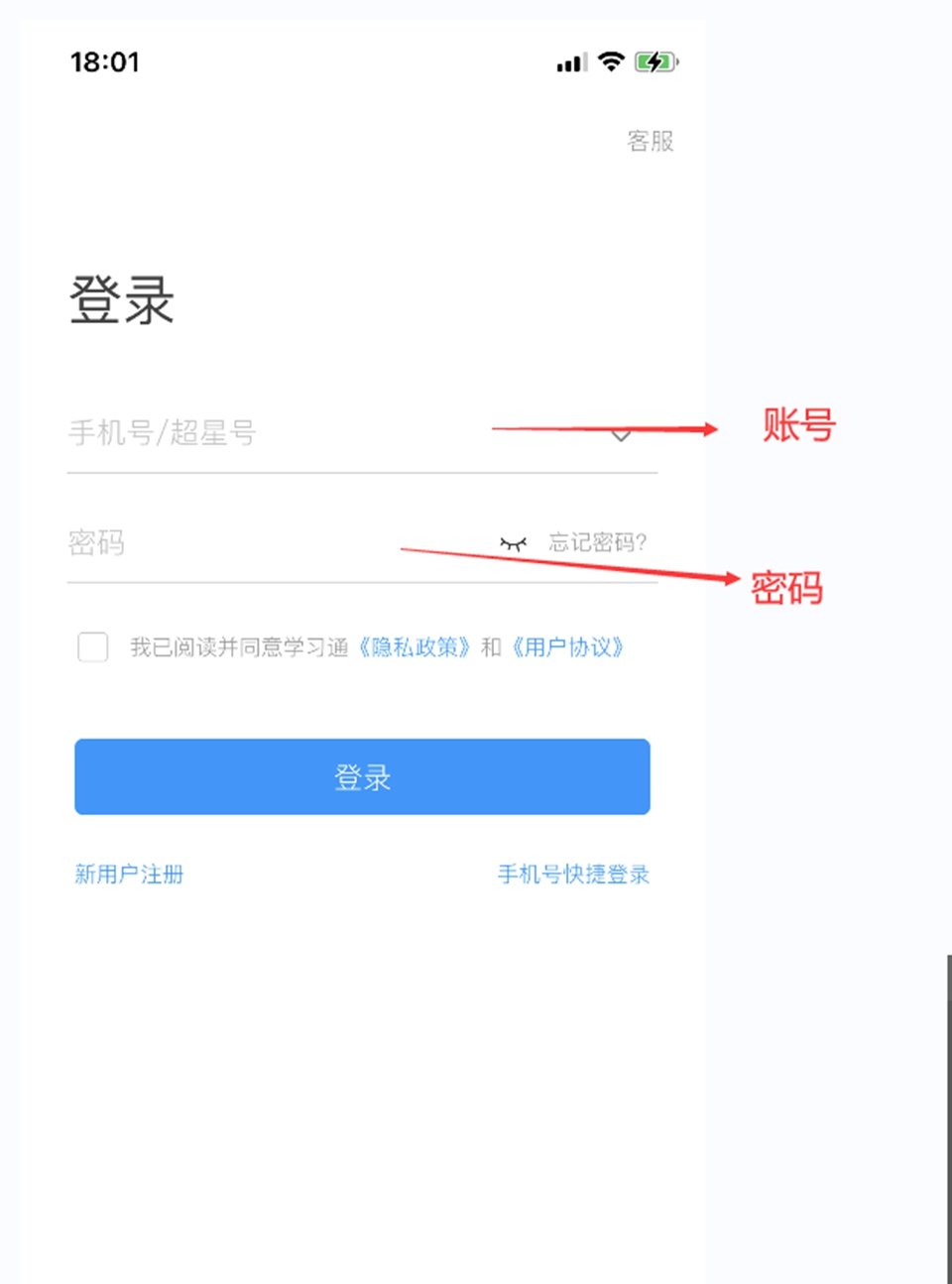 学习通APP登录,使用考试客户端(电脑端)显示的直播账号密码,对应填写进账号和密码,进行登录。