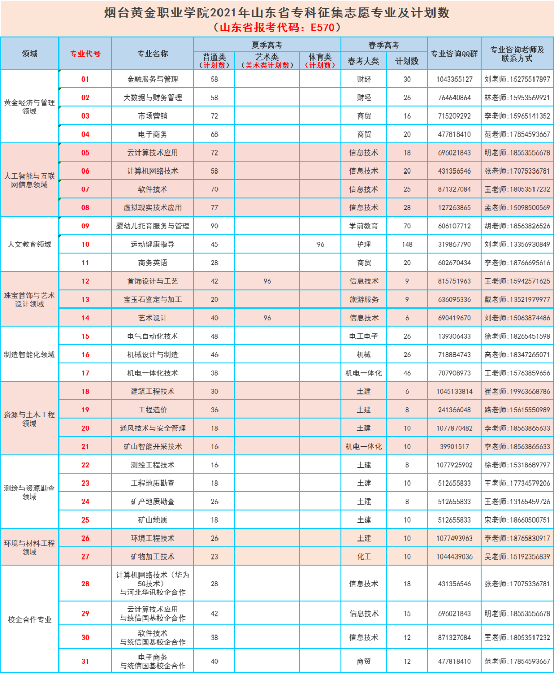 烟台黄金职业学院2021年征集志愿专业及计划数