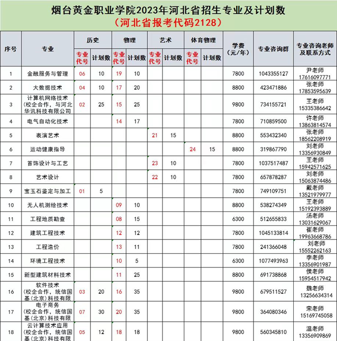 烟台黄金职业学院2023年河北省招生专业及计划数