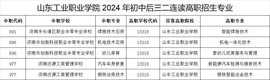 山东工业职业学院2024年初中后三二连读高职招生计划