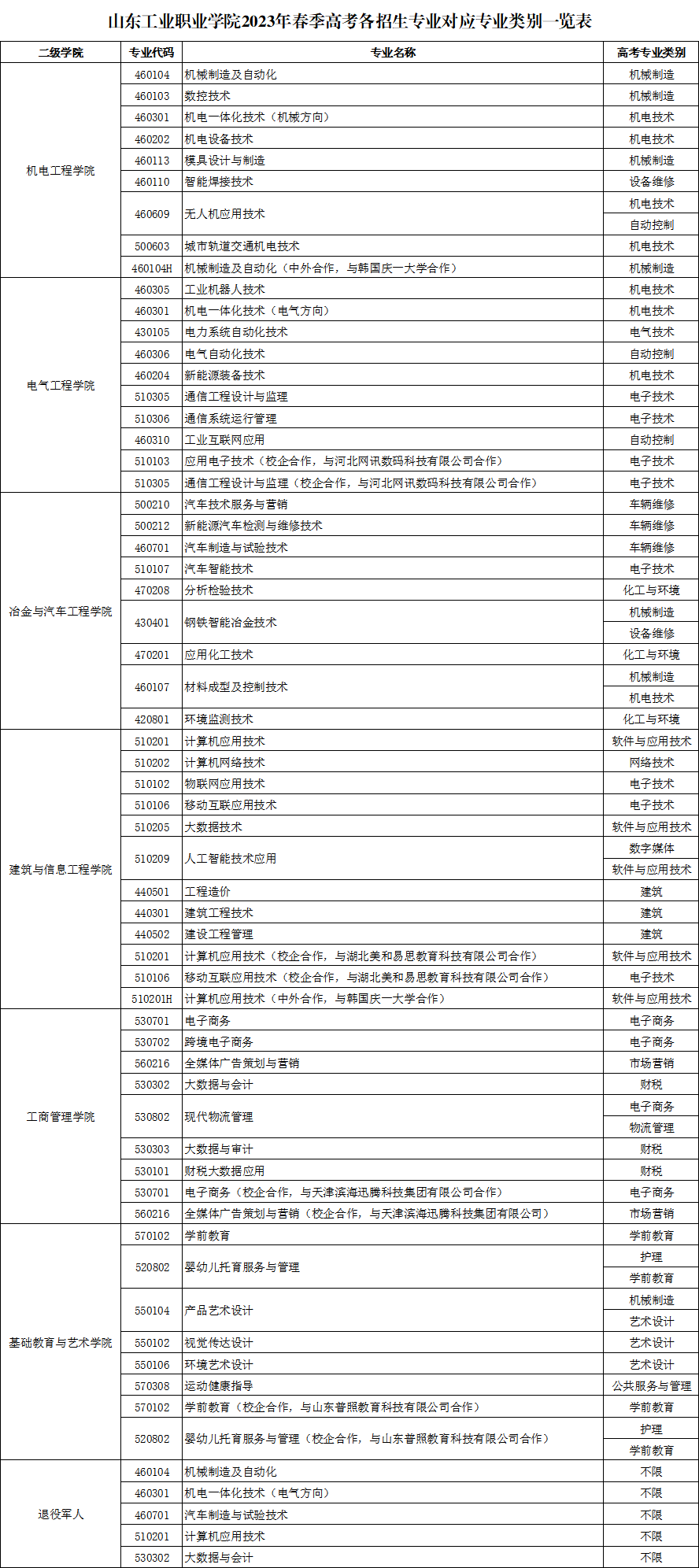 山东工业职业学院2023年春季高考各招生专业对应专业类别一览表