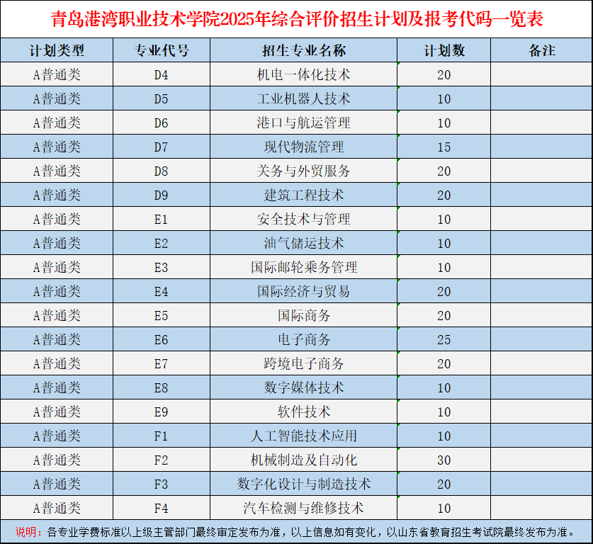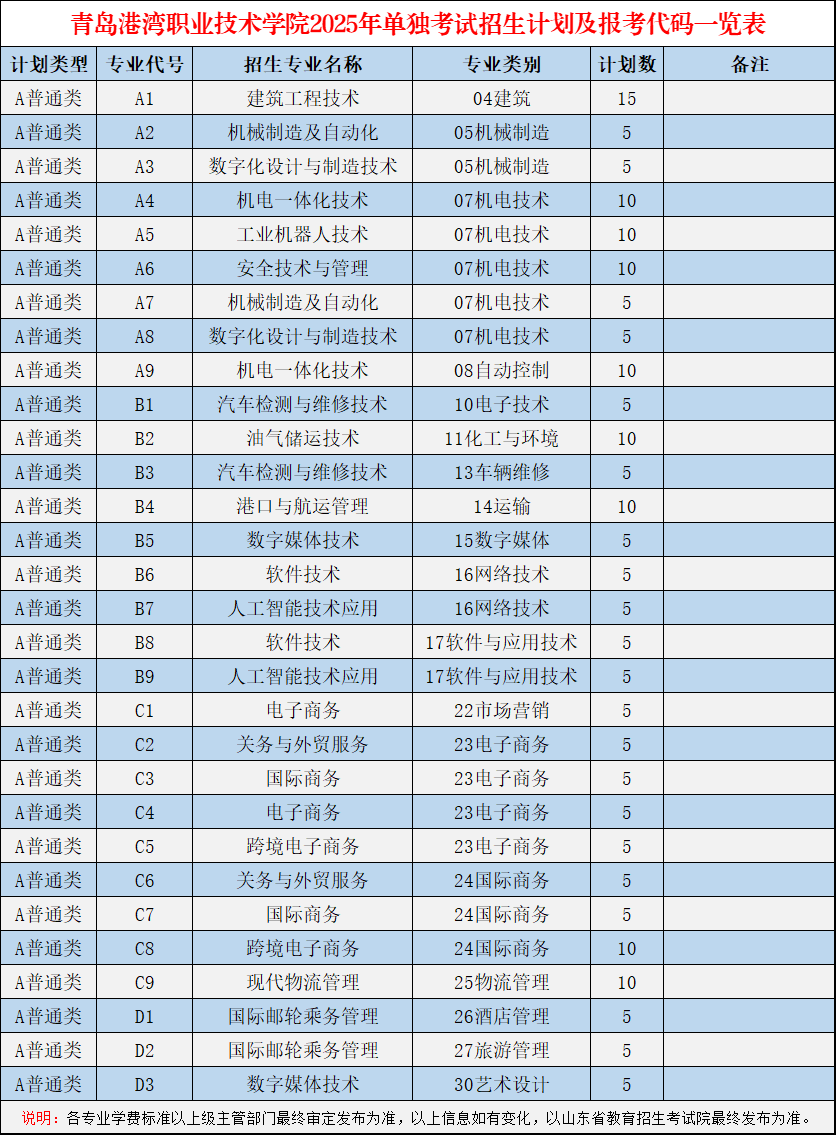 青岛港湾职业技术学院2025年单独考试招生和综合评价招生总计划500人,其中单独考试招生计划200人,综合评价招生计划300人,现将分类型分专业招生计划予以发布如下: