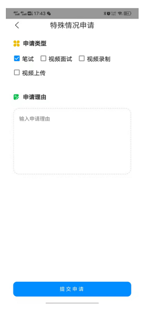 【特殊情况申请】针对于考试过程中出现的异常状态都可以进行申请,等待学校进行审核。