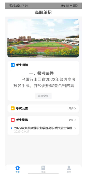 1.【首页】可查看学校的考生须知,考生公告,考生咨询。
