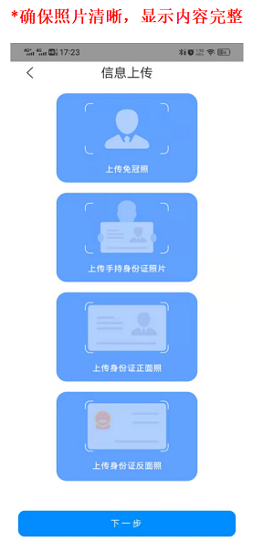 上传信息:手持身份证照片、身份证正面照、身份证反面照片。