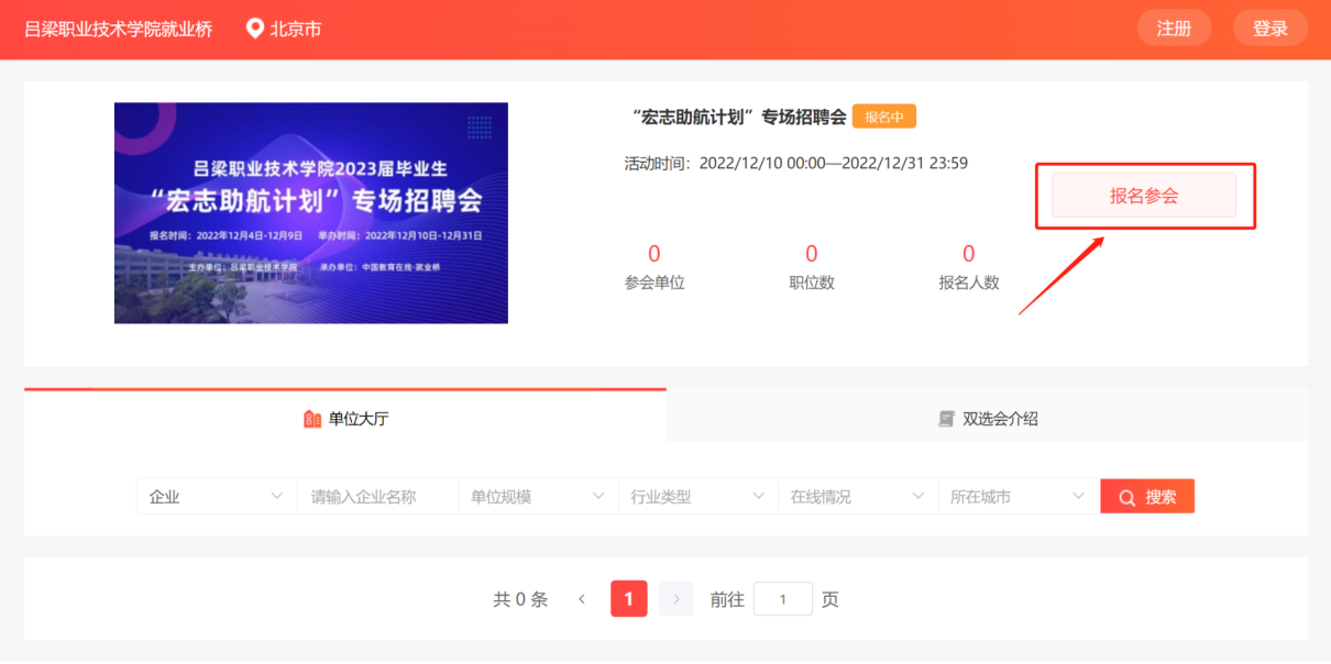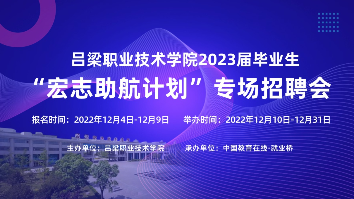 尊敬的用人单位及2023届毕业生: 为全面贯彻落实党中央、国务院“稳就业”“保就业”决策部署,推动我校2023届毕业生就业工作,贯彻落实教育部“宏志助航计划”,开展低收入家庭高校毕业生就业能力培训,提升我校2023届毕业生求职应聘能力,更好地为用人单位和毕业生提供安全、便捷、高效的信息沟通和双向选择平台,全力促进我校毕业生更充分和更高质量就业,我校特联合中国教育在线·就业桥于2022年12月10日-12月31日举办吕梁职业技术学院2023届毕业生“宏志助航计划”专场招聘会,诚邀各用人单位和毕业生报名参会,现将有关事项通知如下:一、活动时间