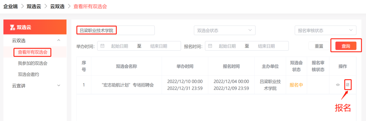 第二步:点击【双选云】模块,在“查看所有双选会”页面中输入“吕梁职业技术学院”并点击【查询】后选择“宏志助航计划”专场招聘会,点击【报名】填写完相关信息提交即可,待学校审核通过后即为报名成功。