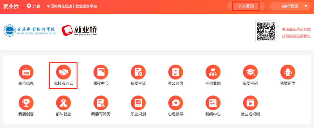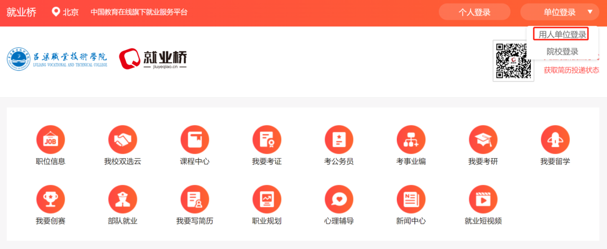 还可登录吕梁职业技术学院就业桥查看,“职位信息”“我校双选云”“课程中心”“我要考研”“我要考证”“我要考公”“我要考事业编”“我要留学”“我要创赛”“部队就业” “我要写简历”“职业规划”“心理辅导”“新闻中心”“就业短视频”十五个内容模块,全方面了解生涯发展去向。六、会务联系(一)吕梁职业技术学院招生就业处:邮箱:llmx123@163.com联系电话:0358-7849923网址: www.llzy.edu.cn(二)中国教育在线·就业桥:邮箱:zqtz@eol.cn联系电话:①用人单位如有注册问题,请联系郭老师 15305169175②学生如有注册问题,请联系李老师 15711379032温馨提示:1.建议电脑端使用火狐浏览器或谷歌浏览器登录2.操作详情及其他功能使用请查看:《用人单位操作手册》链接:https://shimo.im/docs/wV3VVdabOoCa013y/《学生操作手册》链接:https://shimo.im/docs/loqeWdp2mOUReVAn/请您关注“吕梁职业技术学院就业桥”及时获取我校冬季网络双选会最新信息。吕梁职业技术学院招生就业处2022年12月4日