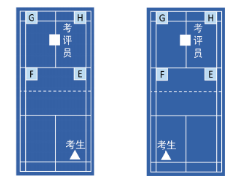 考生在双打后发球线前准备击球。要求快速吊球,进入吊球落点有效区域为成功。考评员发球后考生可以选择起跳或原地吊球。但在击球前双脚不能踩线或超越双打后发球线。落点必须严格按照E、F、G、H的顺序走(E、F、G、H的面积都是100cm×100cm,从场地线的外沿测量),并且自由选择的两点要在测试前提前选择。考评员发球没有发到考生站位区域时,考生可以不接,考评员重新发球。