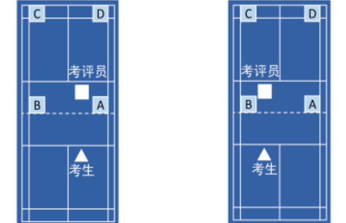 ①右侧场区击球(共10个球):由考评员向考生右侧网前抛球,考生站在前发球线后上网,并按照固定的顺序,运用放、勾、推技术将球分别击到指定的区域内(A、B、C、D),并轮转2次(共击8个球),最后两球应击到提前选择的2个区域内(A、B 区域任选其一,C、D区域任选其一)。如图3所示。