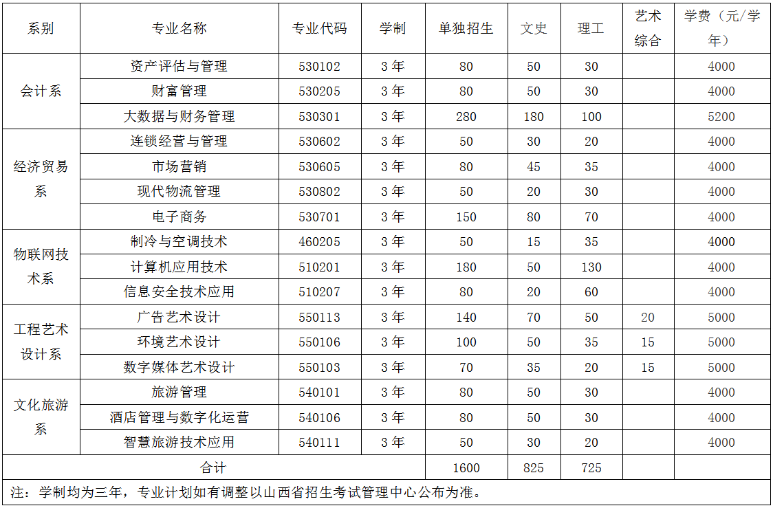 山西财贸职业技术学院2022年单独招生分专业招生计划