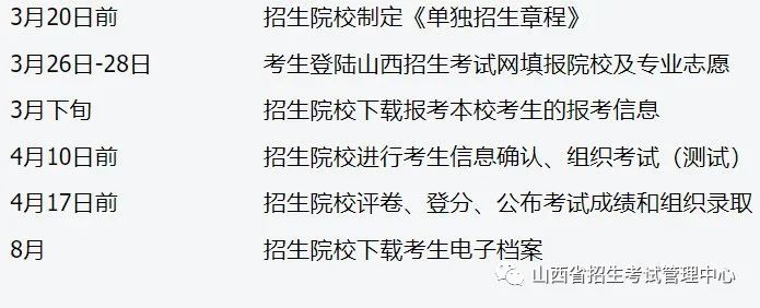 单独招生院校:1山西省财政税务专科学校、2长治职业技术学院、3山西艺术职业学院、4晋城职业技术学院、5山西药科职业学院、6大同煤炭职业技术学院、7山西机电职业技术学院、8山西财贸职业技术学院、9山西林业职业技术学院、10山西水利职业技术学院、11阳泉职业技术学院、12临汾职业技术学院、13山西职业技术学院、14山西金融职业学院、15太原城市职业技术学院、16山西信息职业技术学院、17山西体育职业学院、18山西警官职业学院、19山西国际商务职业学院、20潞安职业技术学院、21太原旅游职业学院、22山西旅游职业学院、23山西管理职业学院、24山西电力职业技术学院、25忻州职业技术学院、26山西同文职业技术学院、27山西华澳商贸职业学院、28山西运城农业职业技术学院、29运城幼儿师范高等专科学校、30山西老区职业技术学院、31山西经贸职业学院、32朔州职业技术学院、33运城职业技术大学、34山西铁道职业技术学院、35晋中师范高等专科学校、36阳泉师范高等专科学校、37山西青年职业学院、38运城师范高等专科学校、39朔州师范高等专科学校、40吕梁职业技术学院、41太原幼儿师范高等专科学校、42山西工程职业学院、43长治幼儿师范高等专科学校、44山西通用航空职业技术学院、45朔州陶瓷职业技术学院、46山西卫生健康职业学院、47长沙民政职业技术学院、48北京社会管理职业学院(民政部培训中心)。