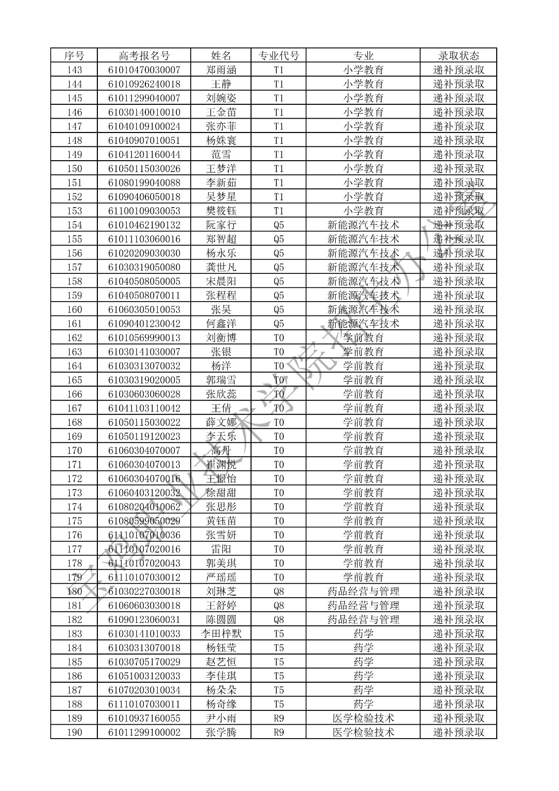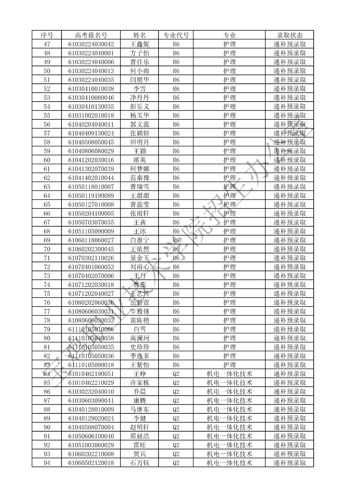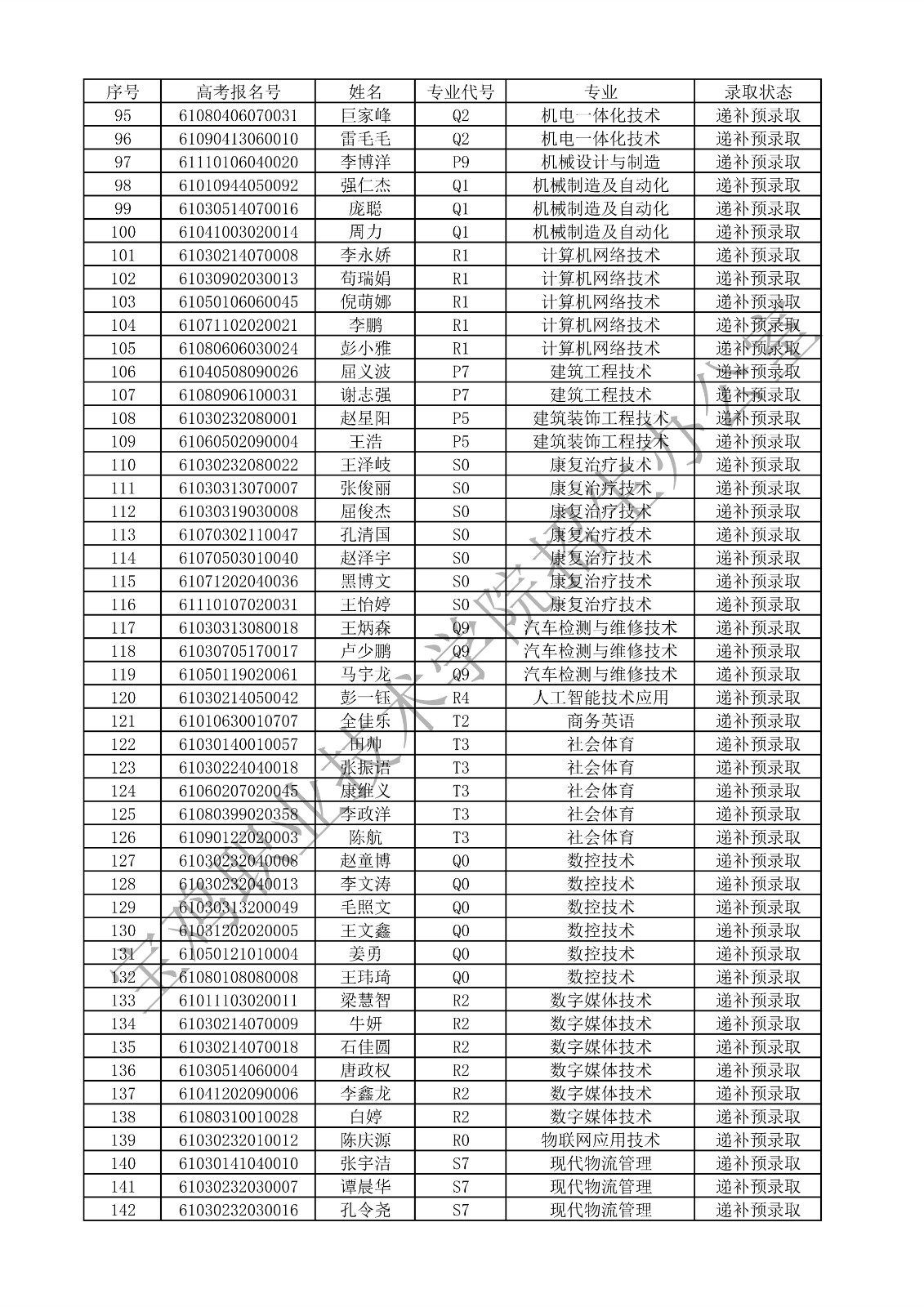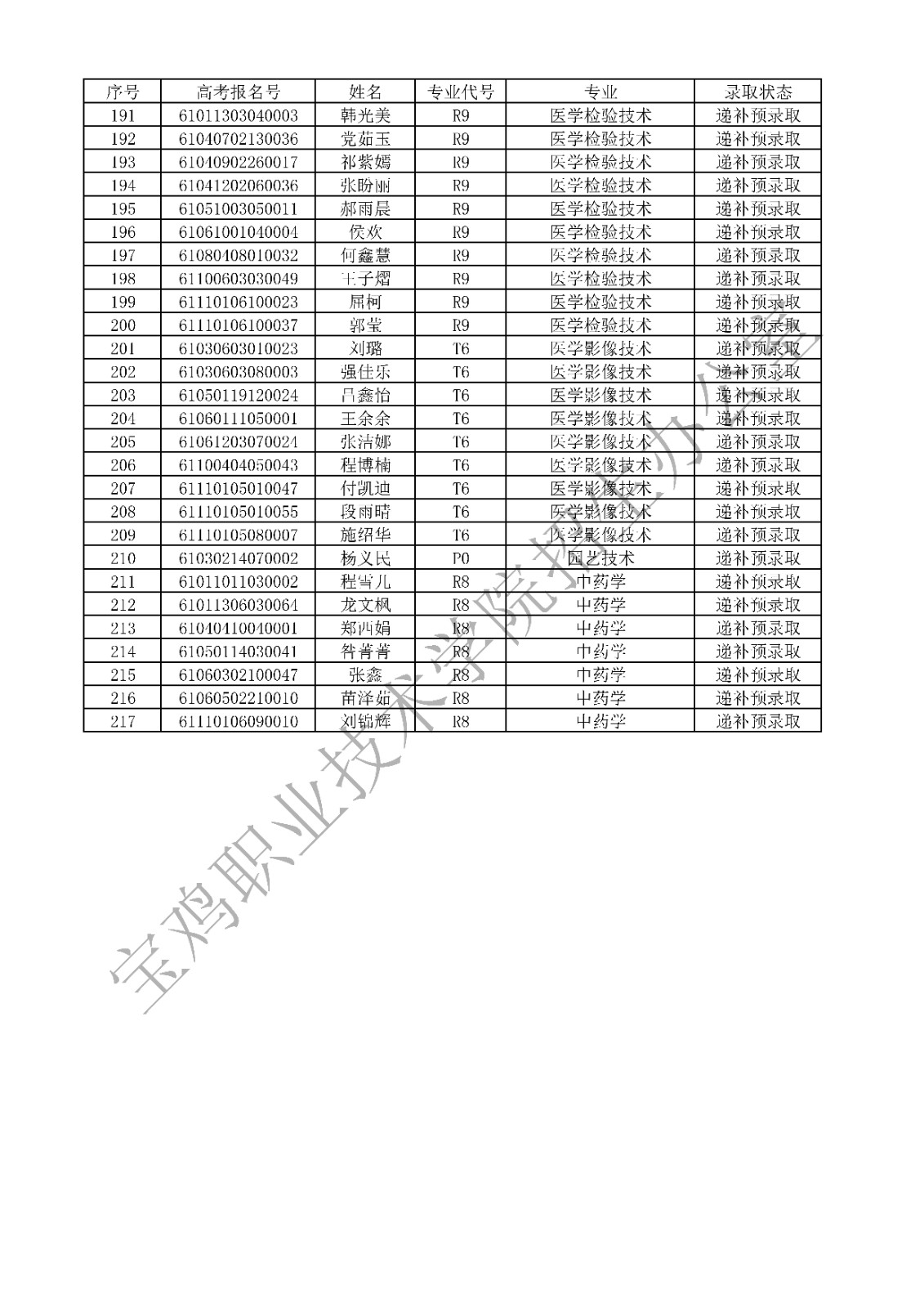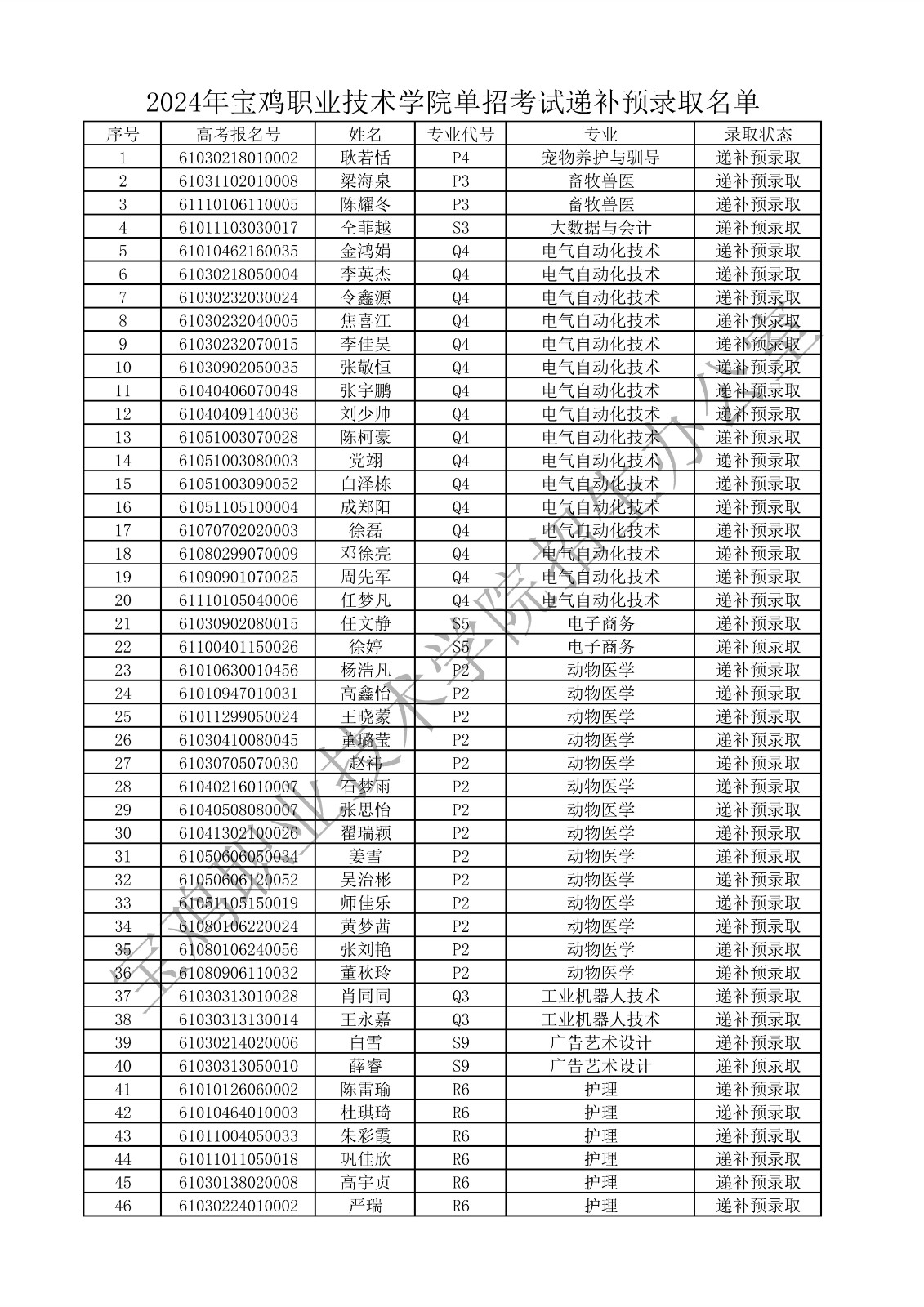 2024年宝鸡职业技术学院单独考试招生递补预录取名单