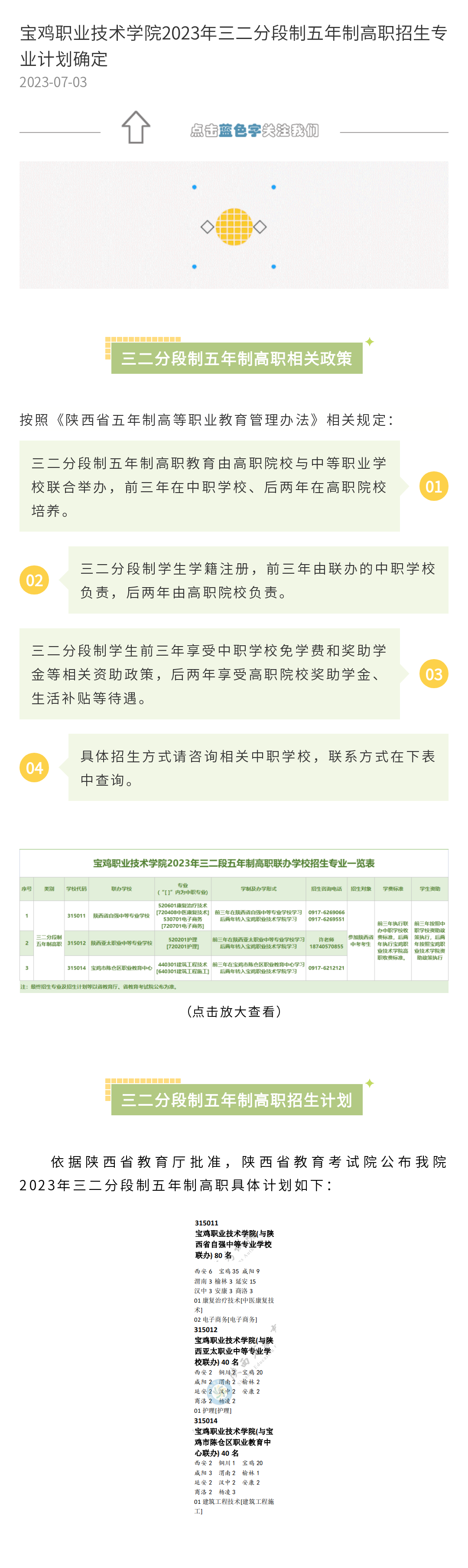 宝鸡职业技术学院2023年三二分段制五年制高职招生专业计划