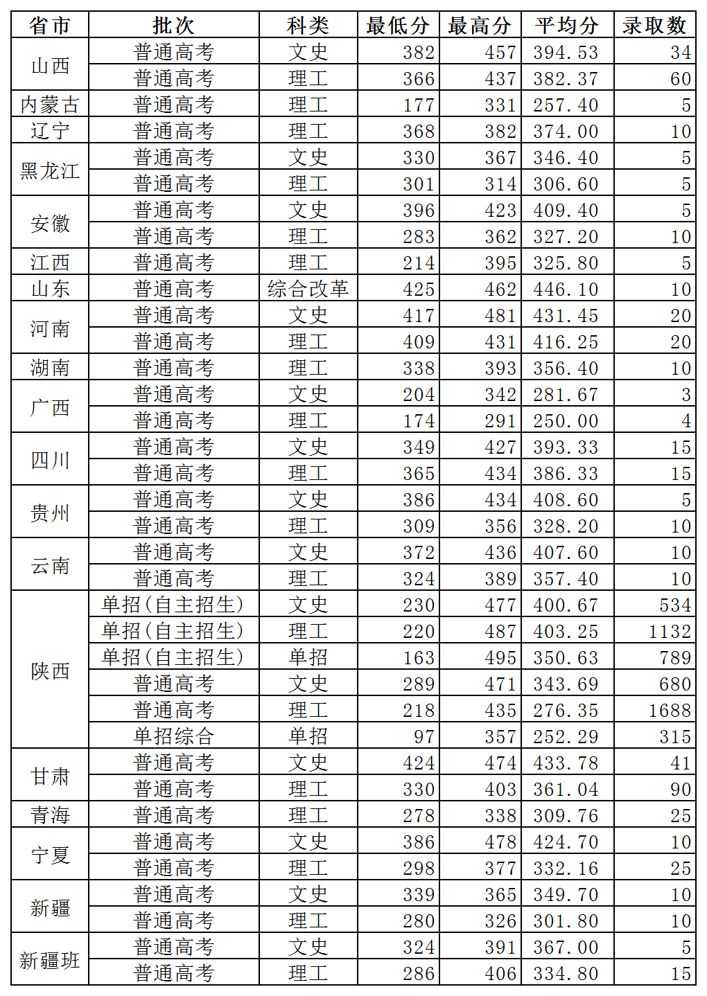 2020年我院在各省市录取情况一览表