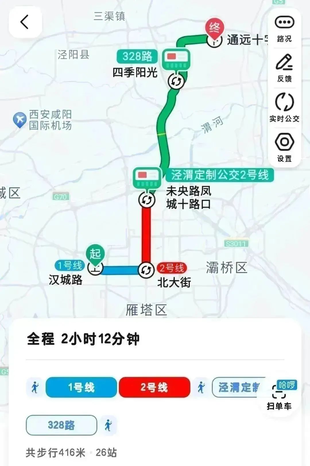全程约2小时。步行至汉城湖地铁(纺织城方向)乘坐五站至北大街地铁站。换乘二号线(草滩方向)乘坐七站至凤城十路地铁站(D 东北口出站)。步行至未央路凤城十路公交站,乘坐泾渭定制公交 2 号线两站至四季阳光公交站换乘 328 路公交车,乘坐 12 站至通远十字公交站后步行到达陕西交通职业技术学院(通远校区)。