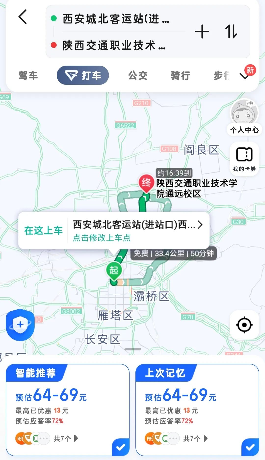 全程约1小时13分钟。推荐乘坐地铁 2 号线(直达)。首先请步行至三爻地铁站(草滩方向)乘坐十三站至凤城五路地铁站(B 西南口出站)。出站后可自行选择步行或骑行共享单车到达陕西交通职业技术学院(文景校区)。