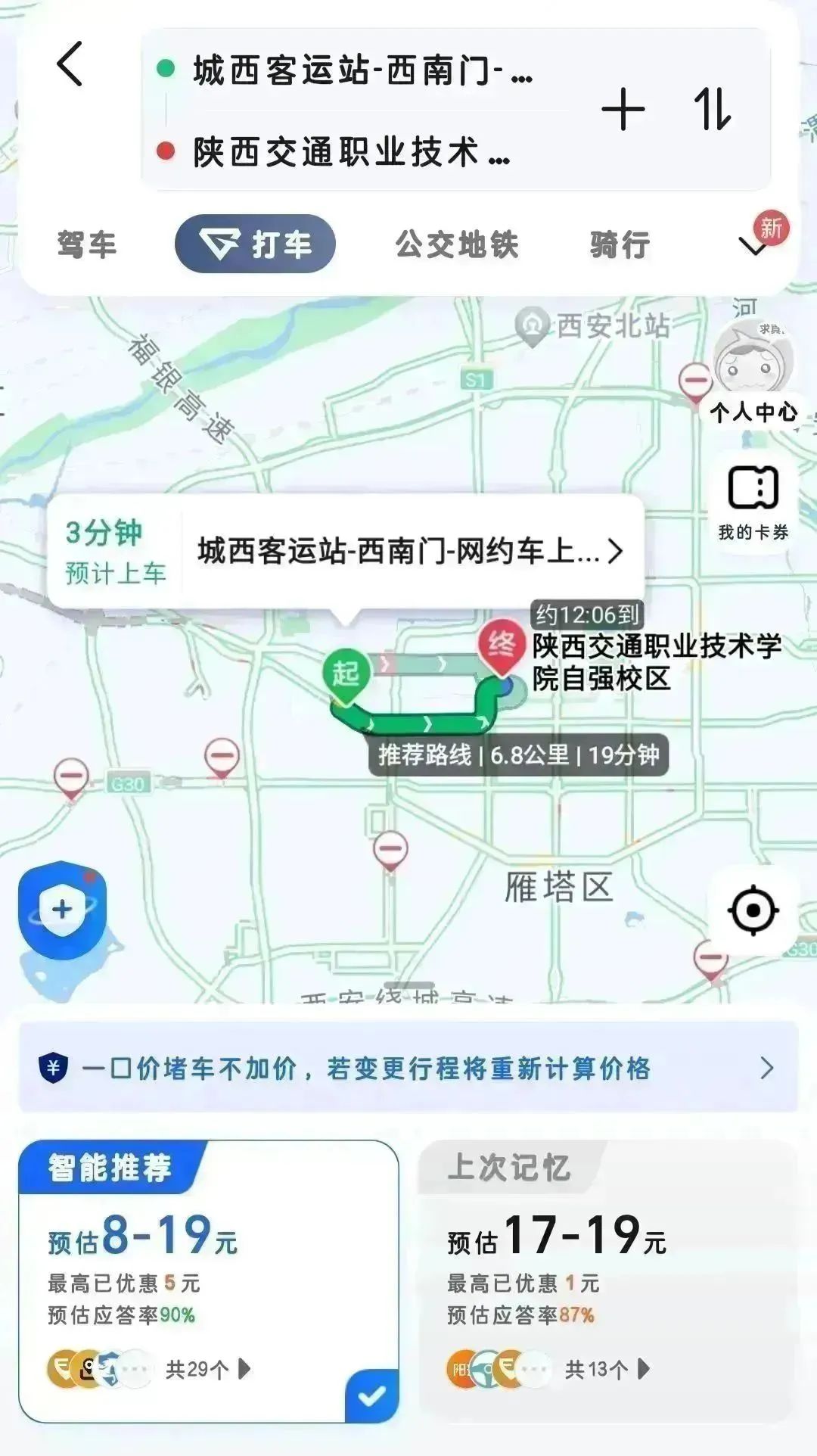 全程约19 分钟。打车费用约为 18 元,全程 6.8 公里。