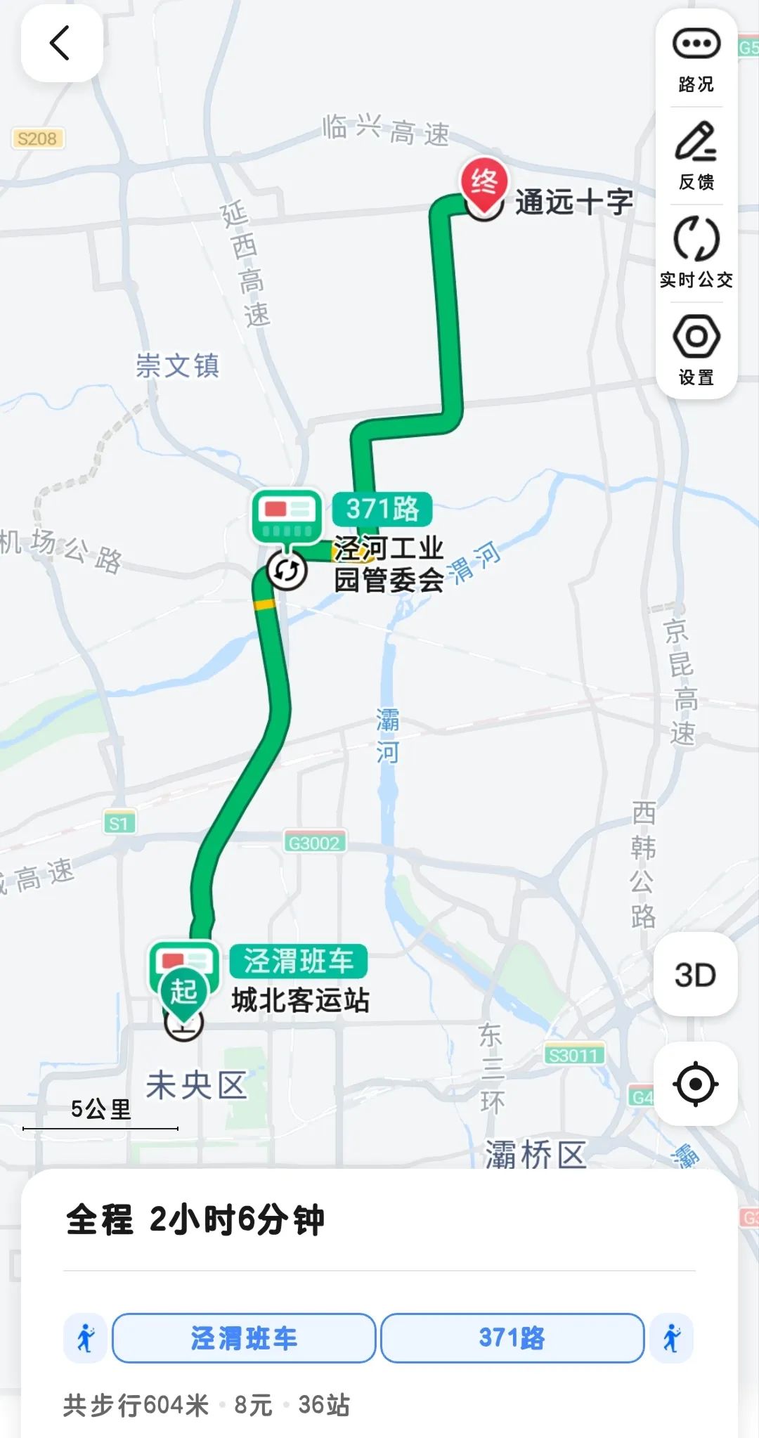 全程约2小时。步行至城北客运站公交站点乘坐泾渭班车至“泾河工业园管委会公交站”,换乘 371 路公交车至“通远十字公交站”。步行 422 米到达陕西交通职业技术学院(通远校区)。