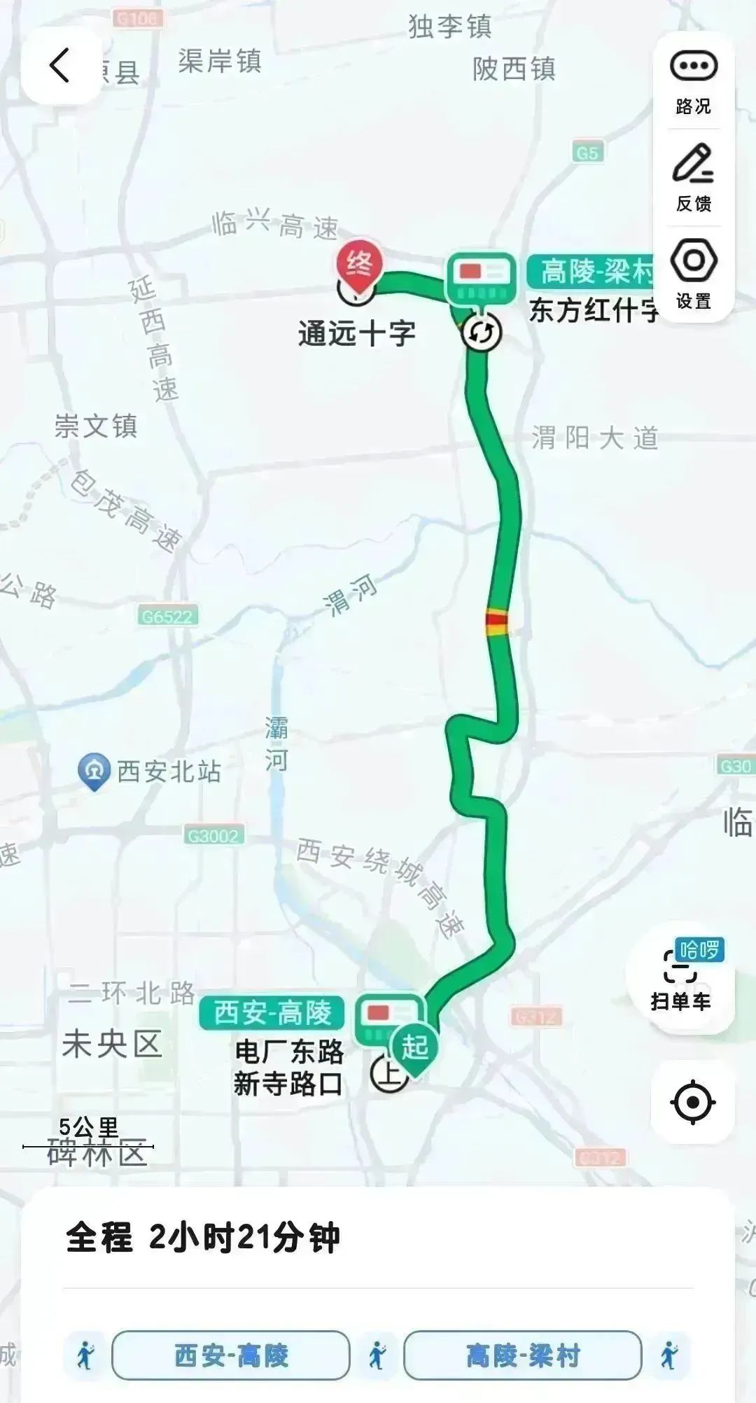 全程约2小时20分钟。推荐乘坐公交,步行1.1公里至电厂东路新寺路口公交站乘坐西安—高陵公交车,二十一站后东方红路什字公交站换乘高陵—梁村公交车,十二站至通远十字公交站下车,步行到达陕西交通职业技术学院(通远校区)。