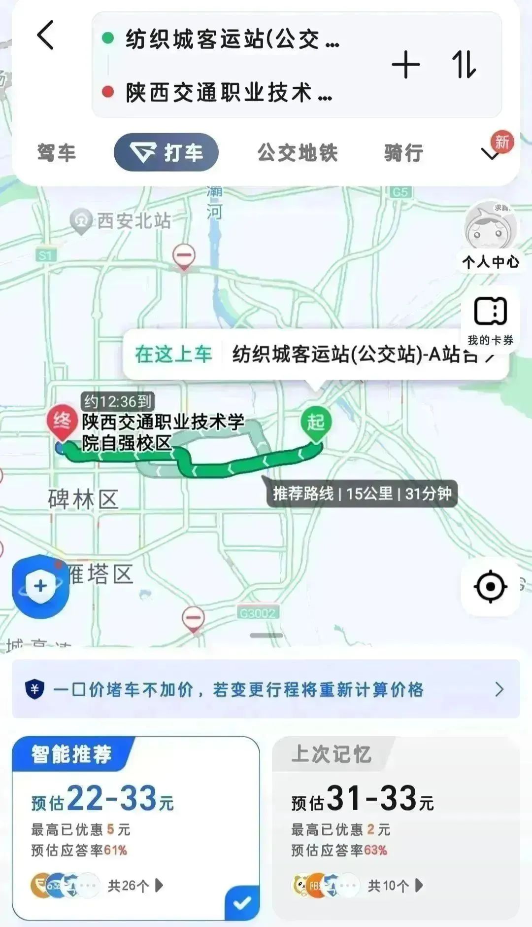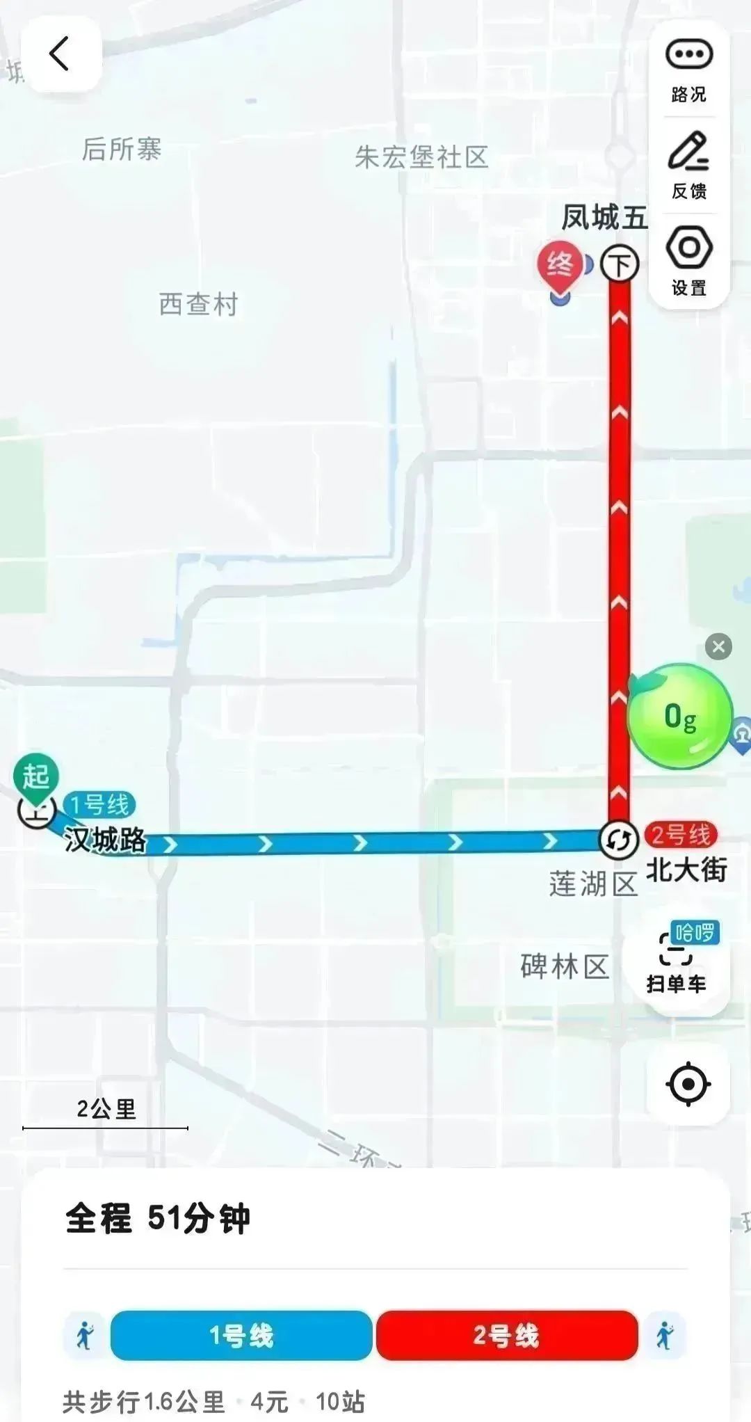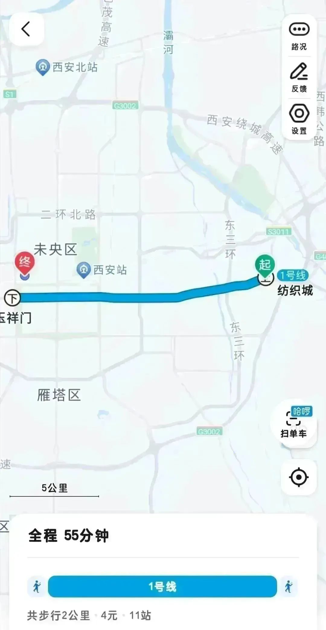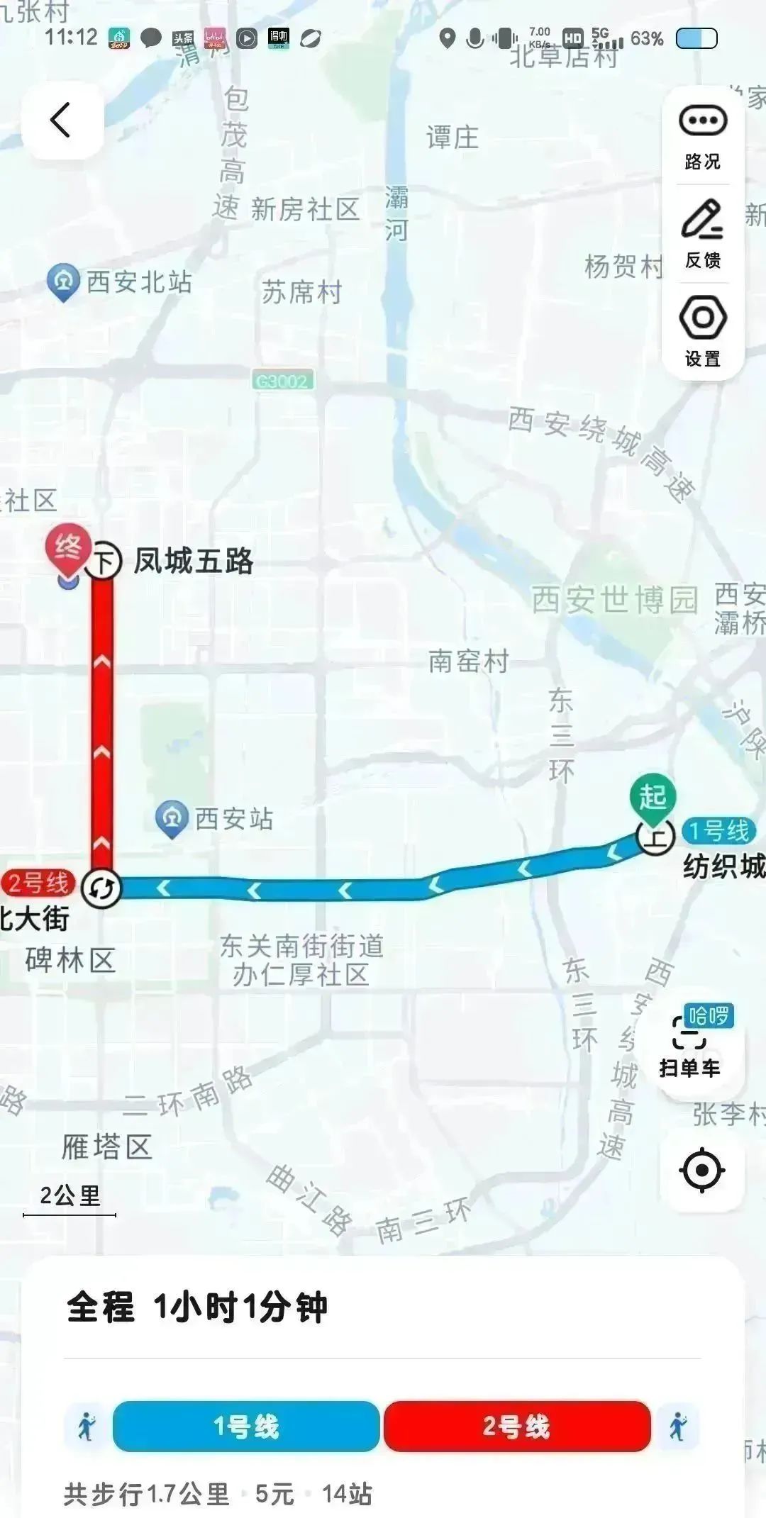 全程约 50 分钟。推荐乘坐地铁,站外步行 119 米到达汉城湖(地铁一号线),乘坐五站后到达北大街地铁站。站内换乘二号线(草滩方向),乘坐五站后到达凤城五路地铁站(B 西南口出站),出站后可自行选择步行或骑行共享单车到达陕西交通职业技术学院(文景校区)。