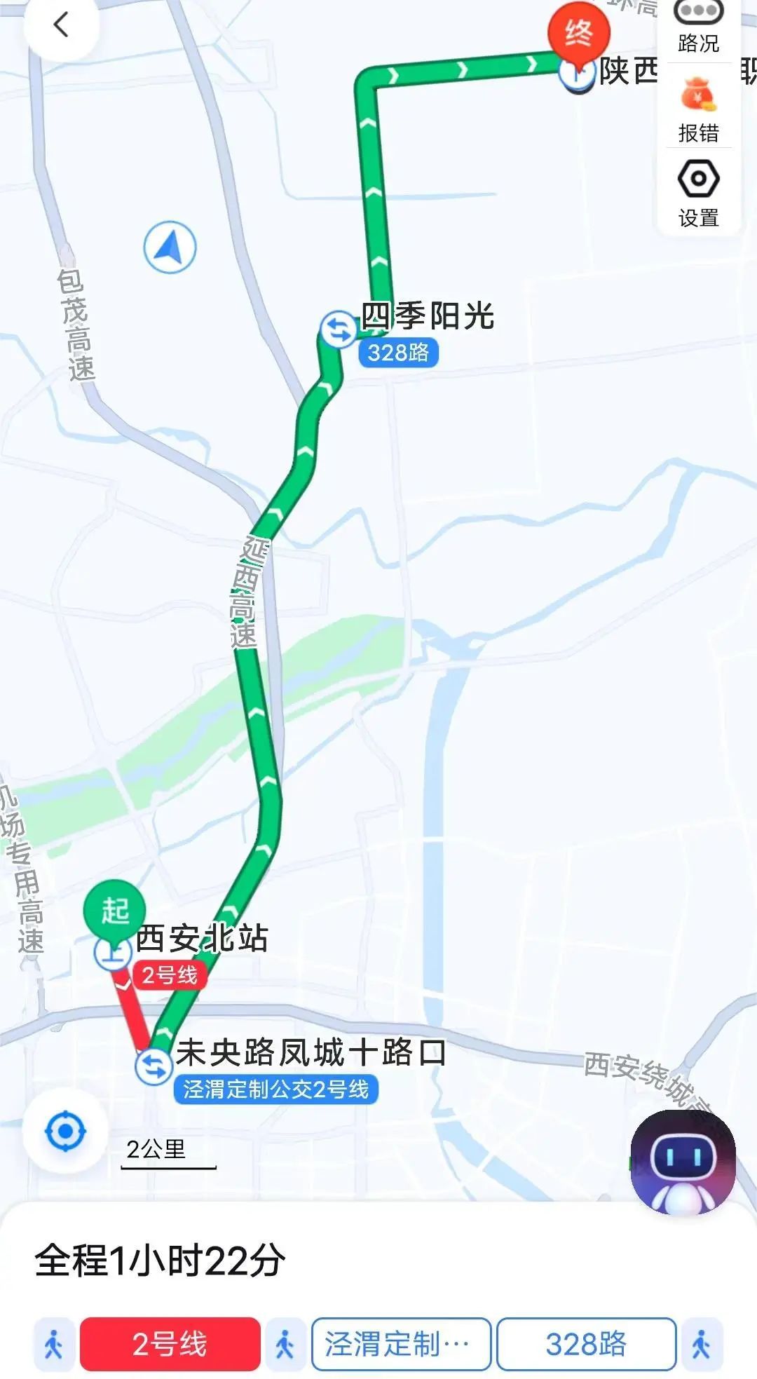 全程约 1 小时 22 分钟。乘坐2号线至凤城十路D口出站,步行217米至凤城十路公交站乘坐泾渭定制公交2号线到达“四季阳光站”,换乘328路,13站后到陕西交通职业技术学院(通远校区)。