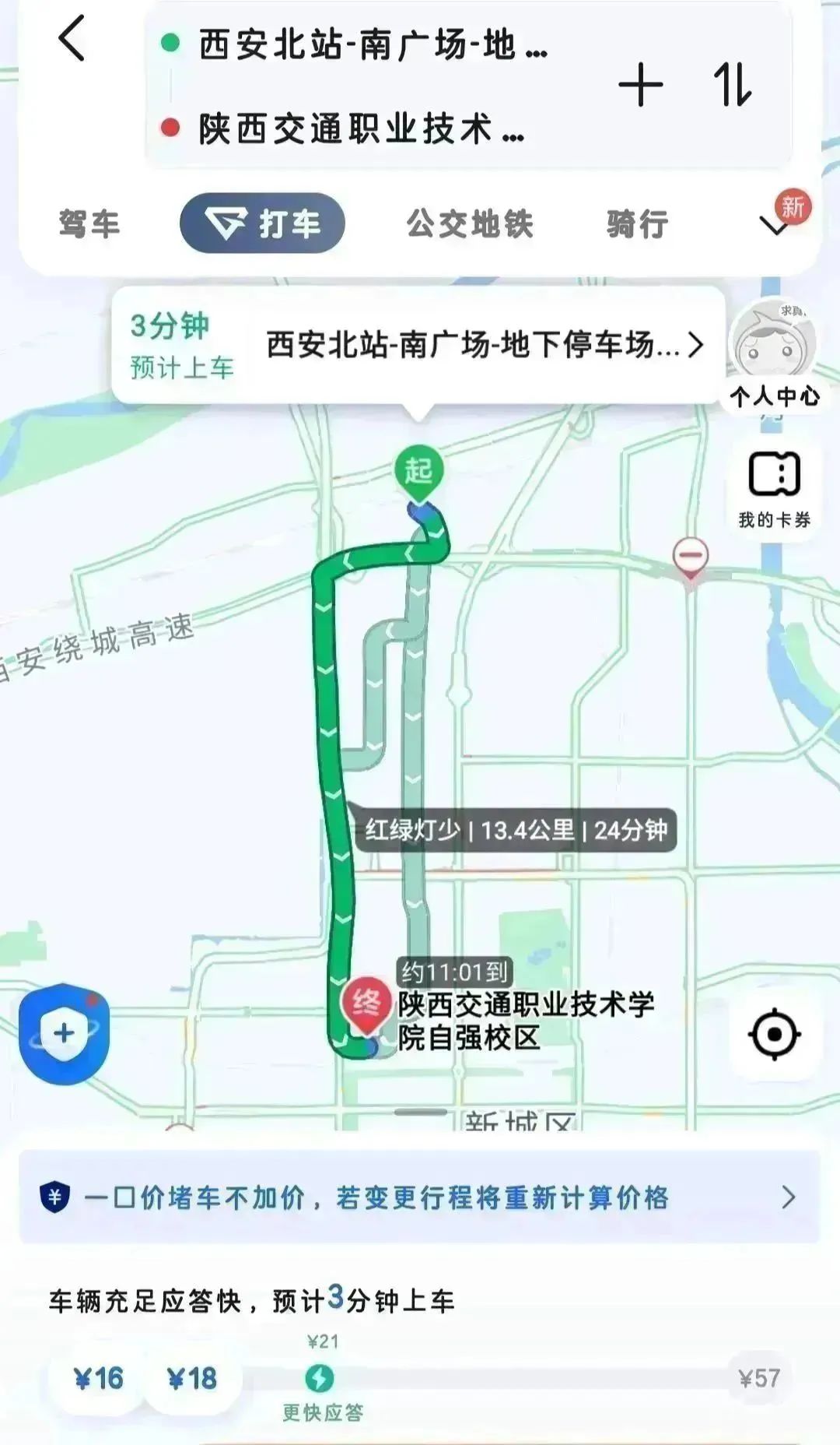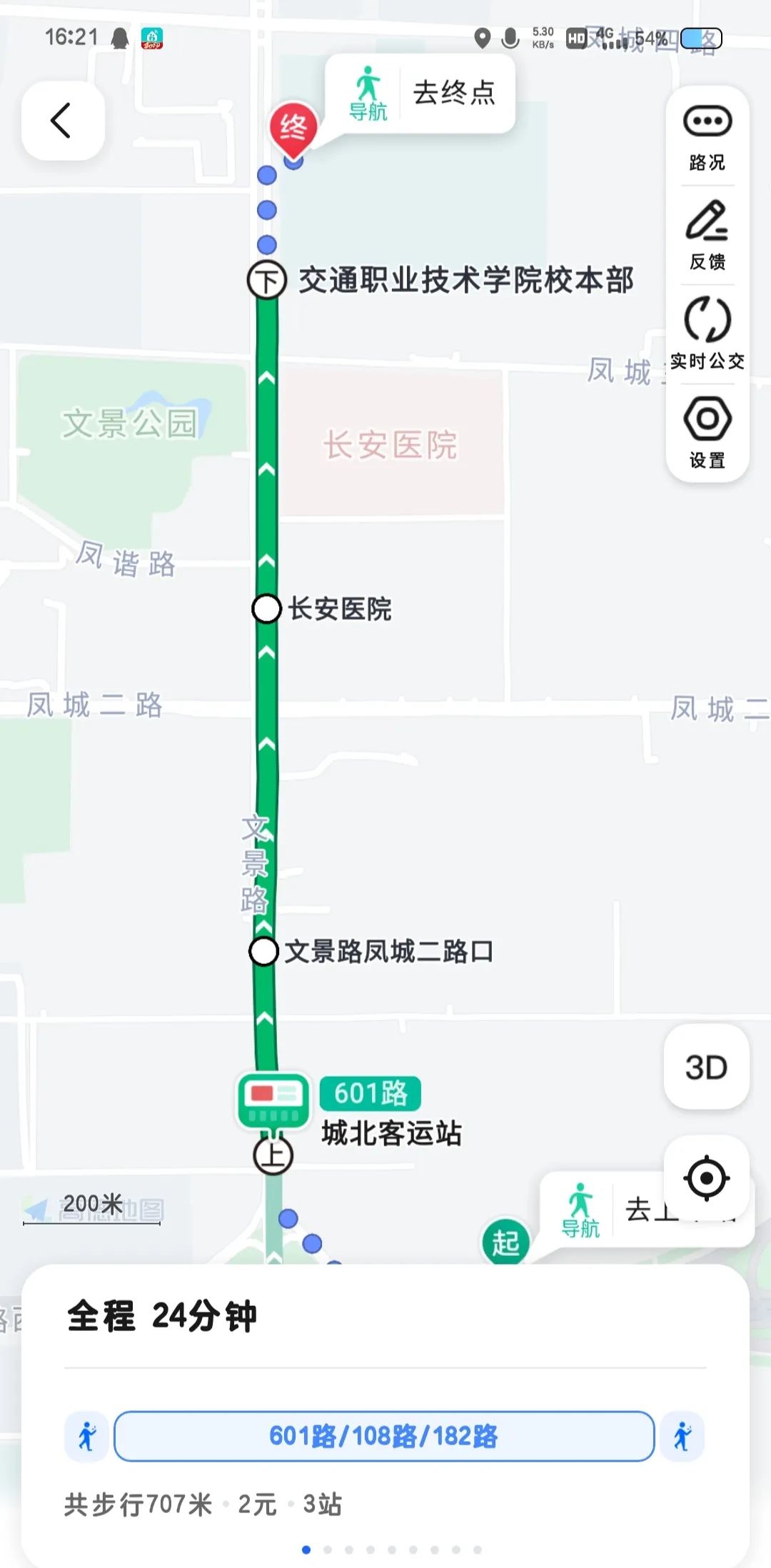 全程约 24 分钟。推荐乘坐公交,步行至城北客运站公交站点,乘坐 601 路、108 路或 182 路公交车三站后到达交通职业技术学院公交站点下车,后步行 210 米即可到达陕西交通职业技术学院(文景校区)。