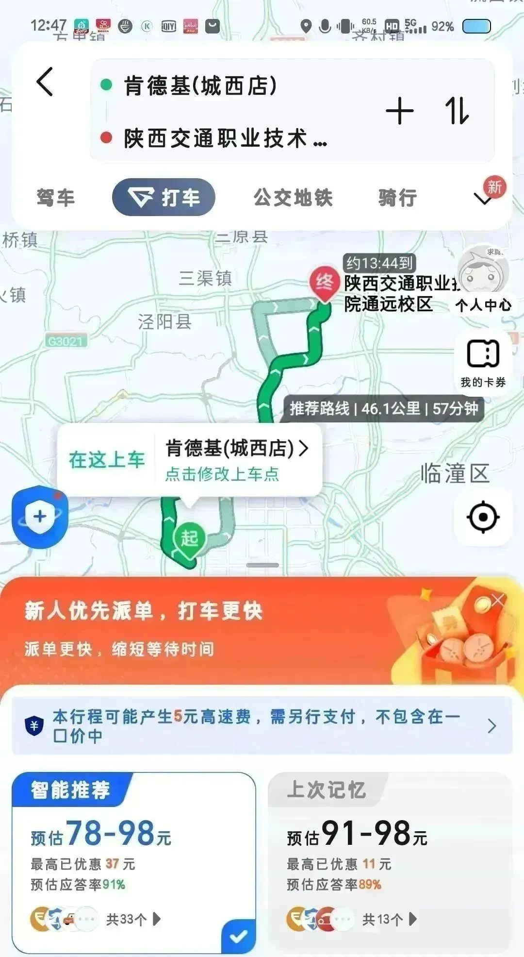 全程约57分钟。费用约100元,全程 46.1公里。建议提前规划、避免高峰期拥堵。