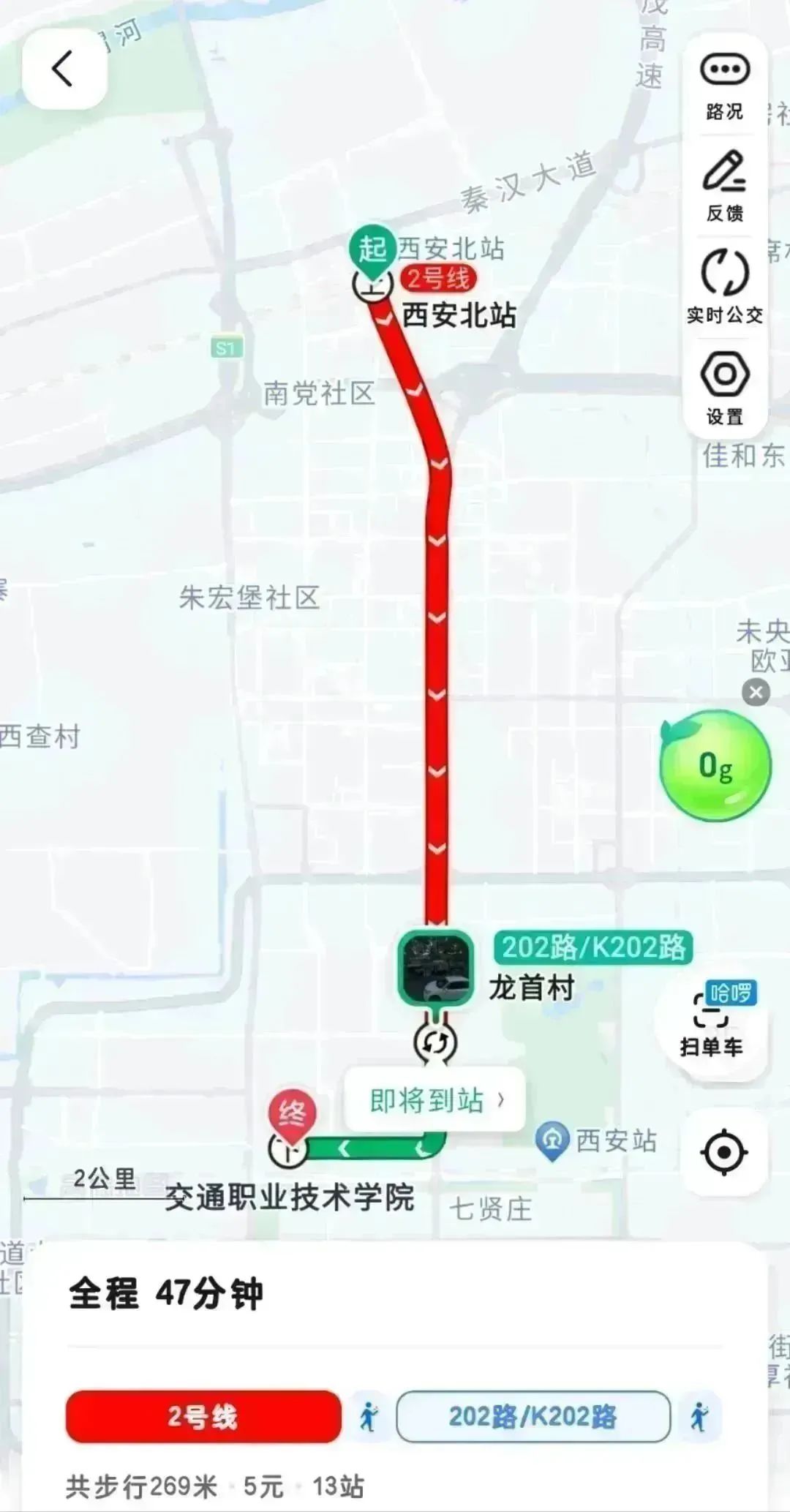 全程约47分钟。前往2号线入口经过7站到龙首原地铁站(B 西南口出站),站外步行208米到“龙首原”公交站,乘坐202路或 K202 路,六站到达陕西交通职业技术学院(自强校区)。
