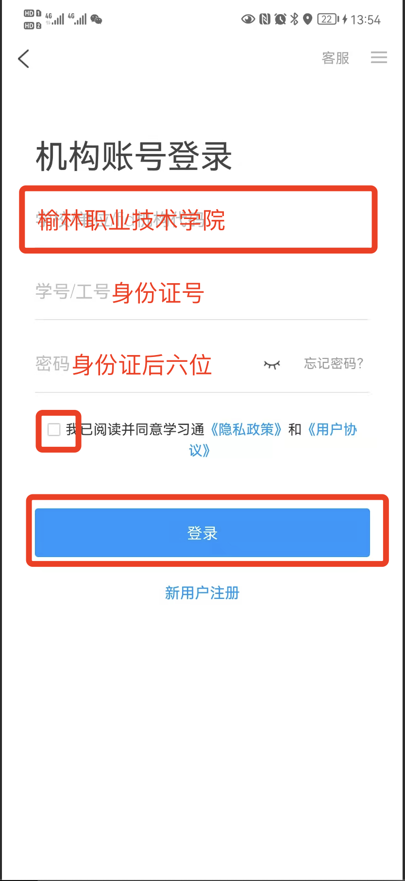 登录时选择“其他方式登录”输入单位名称“榆林职业技术学院”,并输入账号密码(账号:身份证号,密码:身份证后6位)点击登录。
