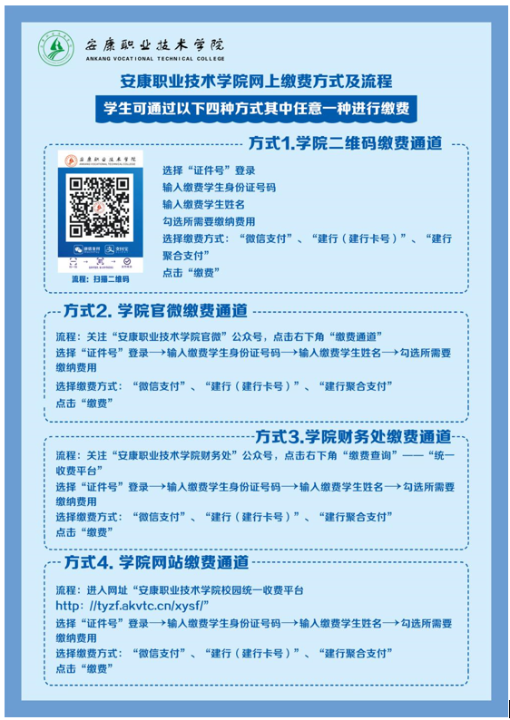 2.缴费渠道:登录学院二维码、学院官微、学院财务处公众号、学院网站缴费。