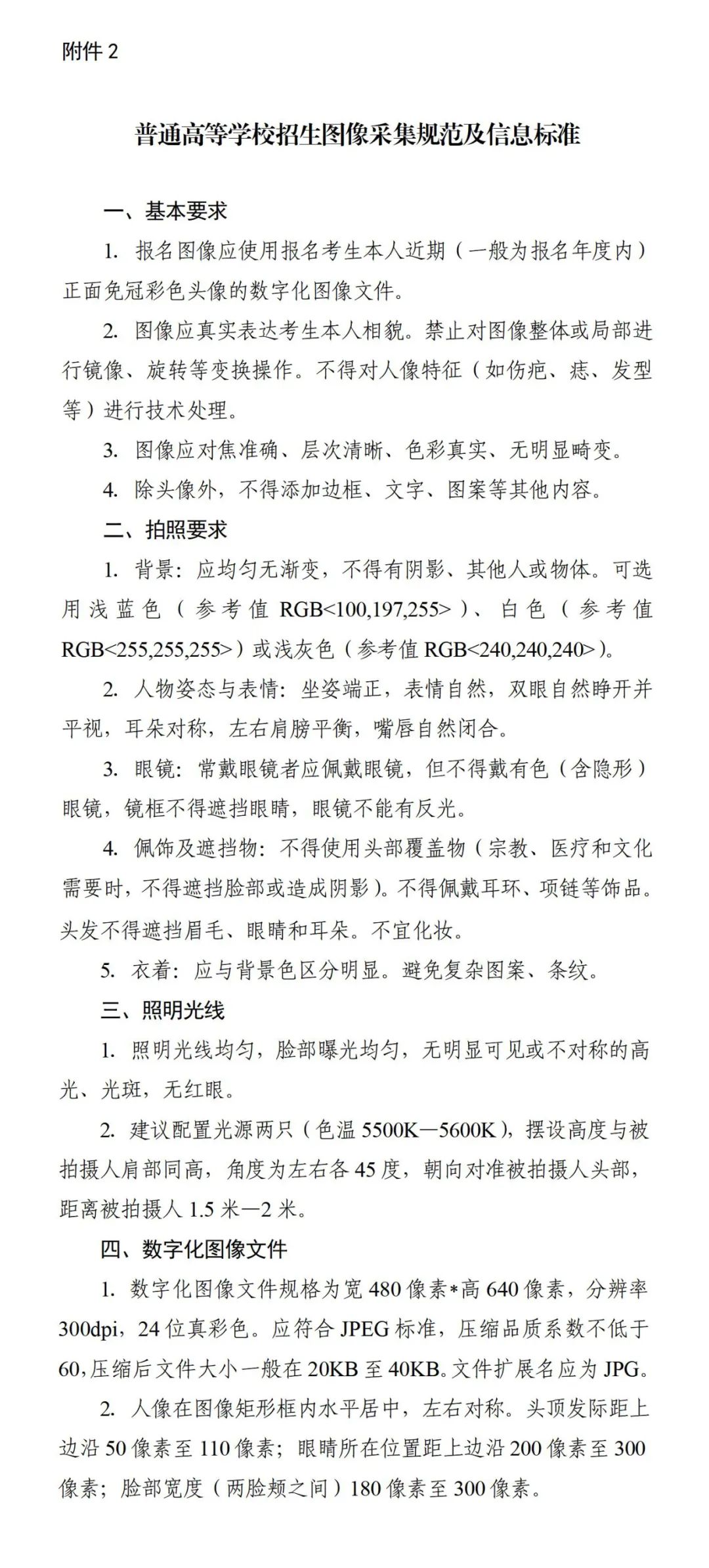 通过资格审查的考生,须在规定时间内,到县(区、市)招生考试机构指定的地点采集居民身份证信息和本人正面免冠彩色头像。头像采集规范及标准按照《普通高等学校招生图像采集规范及信息标准》执行。