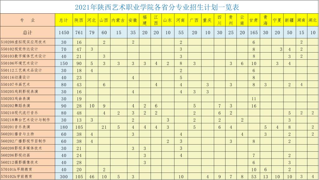2021年陕西艺术职业学院各省分专业招生计划一览表