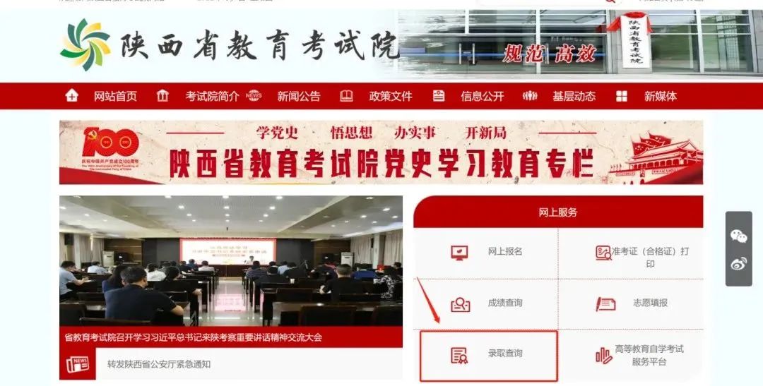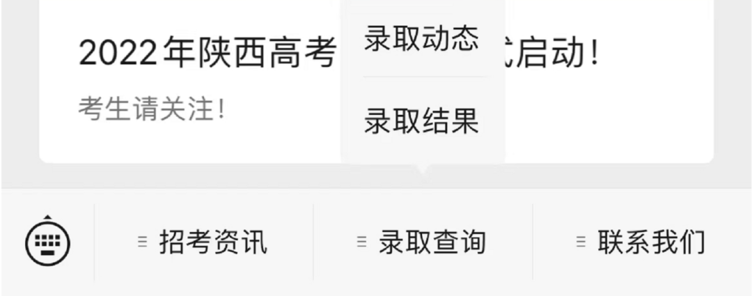 2.微信查询:点击“陕西考试招生”微信订阅号底部菜单“录取查询”,可查询录取动态和录取结果信息。
