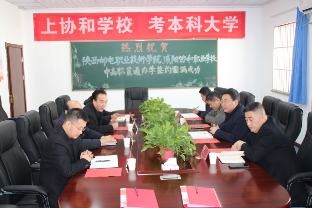 陕西邮电职业技术学院副院长张浩、招生与就业指导中心主任王龙科、经济管理学院院长杨有福、招生与就业指导中心老师姚奇、咸阳协和职业学校副理事长马俊杰、校长井郭涛、执行校长杨长印及副校长马晓峰出席签约仪式。