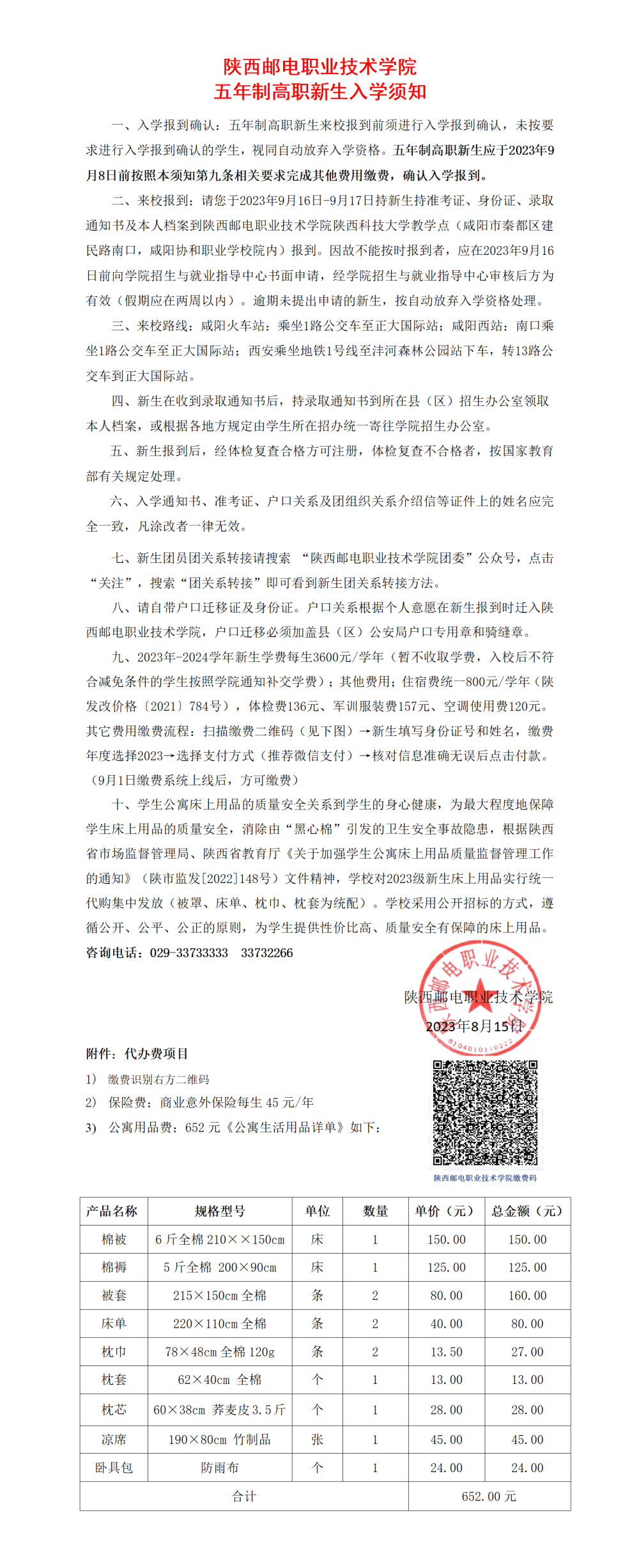 陕西邮电职业技术学院五年制高职新生入学须知