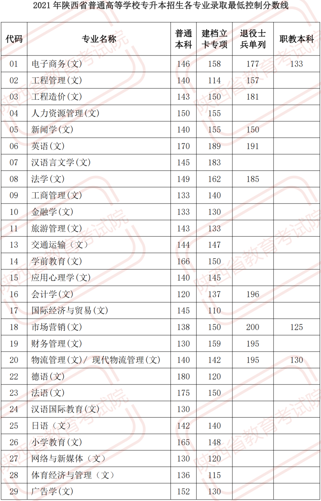 2021年陕西省普通高等学校专升本招生各专业录取最低控制分数线已经划定,现予公布。