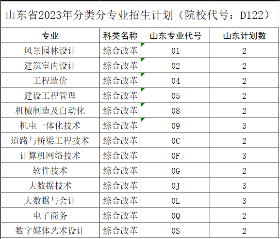 山东省2023年分类分专业招生计划(院校代号:D122)