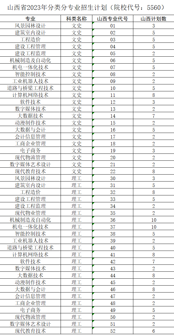 山西省2023年分类分专业招生计划(院校代号:5560)