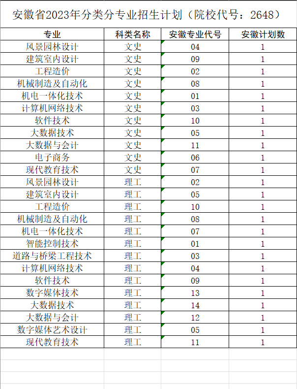 安徽省2023年分类分专业招生计划(院校代号:2648)