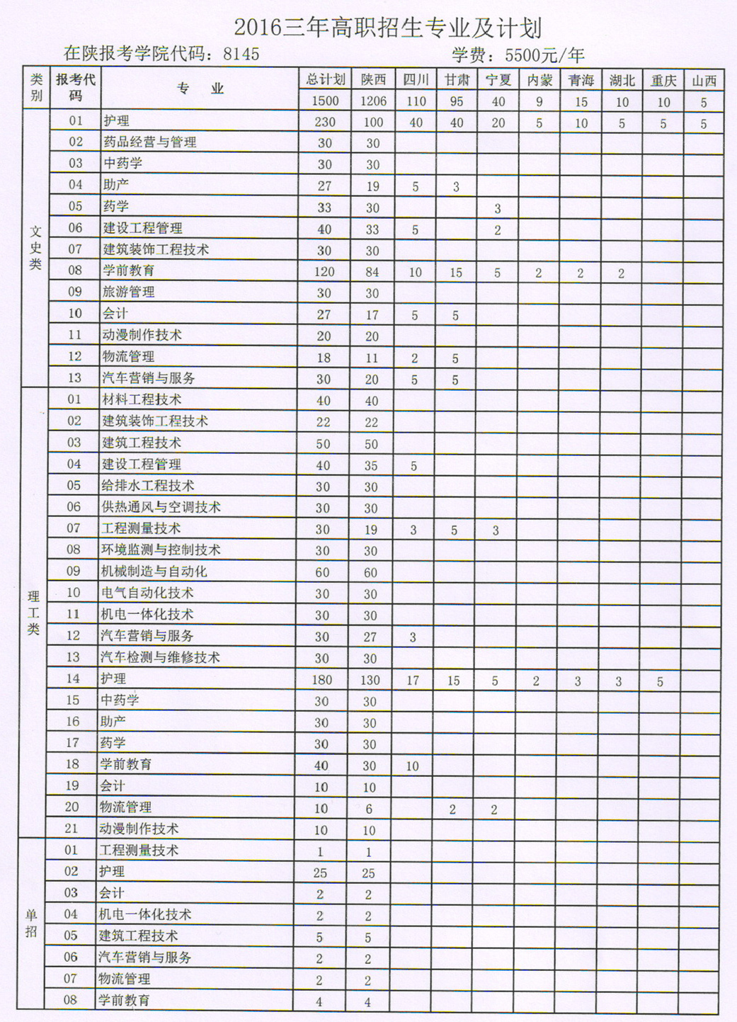 2016三年制招生专业及计划