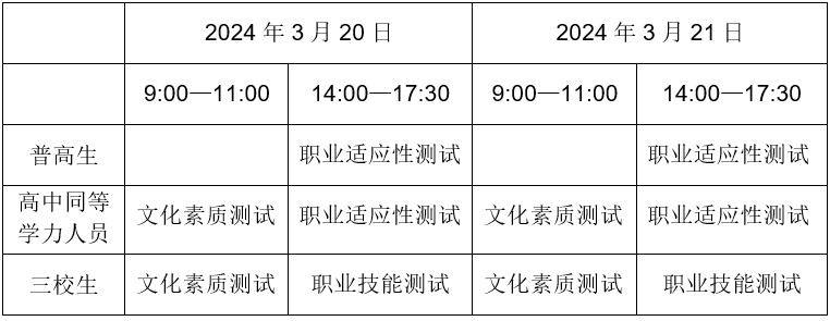 1.文化素质测试:测试内容为中等职业学校通用语文、数学、英语、德育等科目,由学校统一组织从题库中随机抽取试题。普高生使用高中学业水平考试成绩作为文化素质测试成绩。具有高中学历的退役士兵,免文化素质测试。