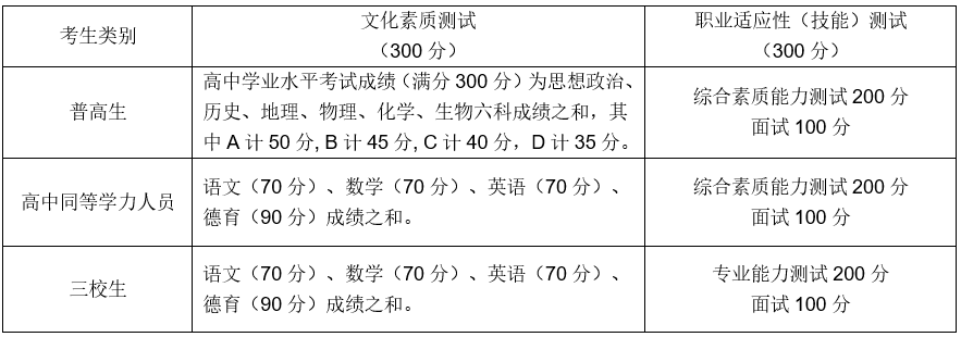 总成绩(600分)=文化素质测试成绩(300分)+职业适应性(技能)测试成绩(300分)。按照普高生和“三校生”,分别进行录取,以不低于实考人数3%的淘汰比例,确定预录取人数。录取时按照总分统一排序,从高到低,择优录取,若总成绩相同,依次参考职业适应性(技能)测试成绩。
