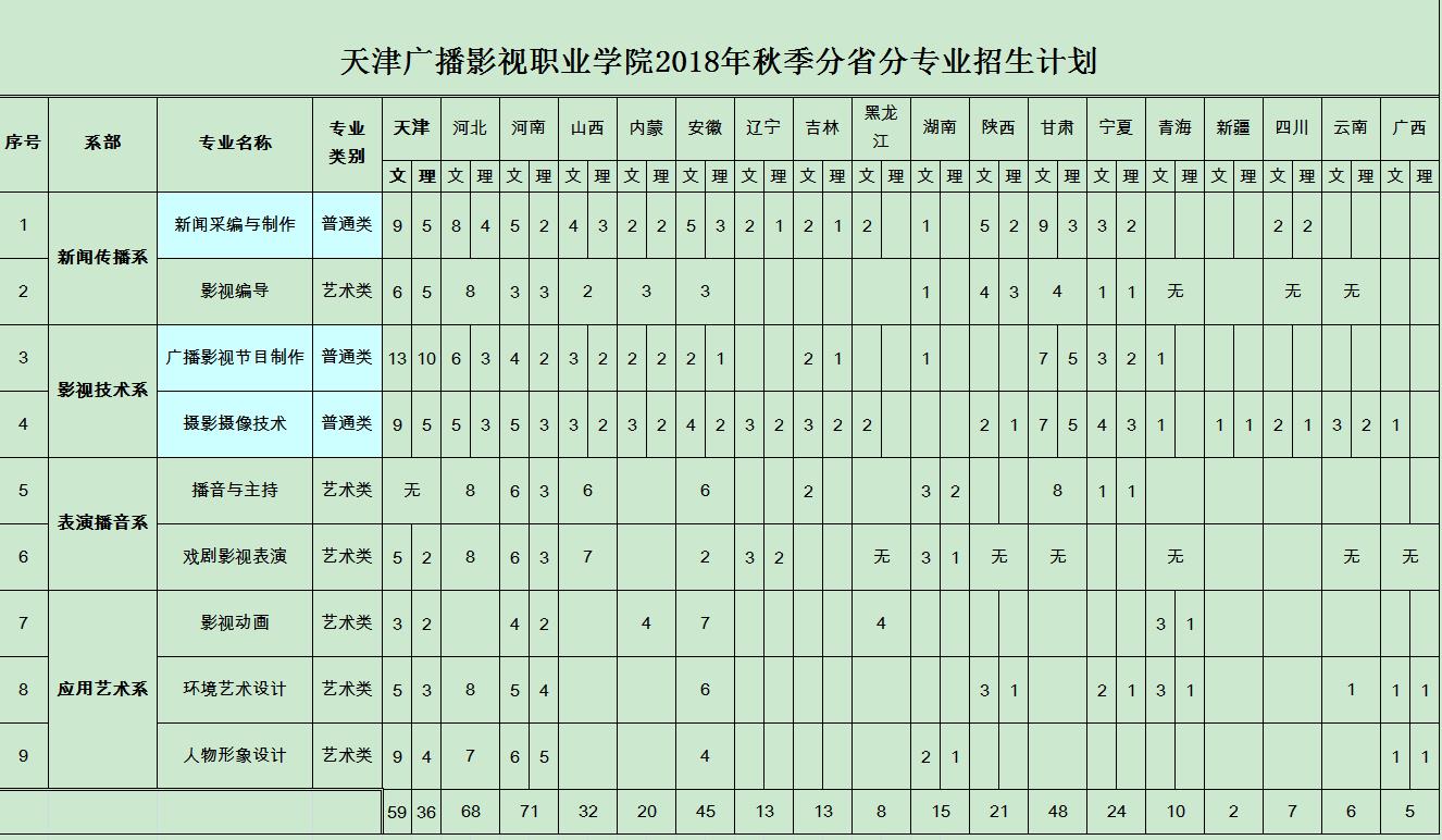 天津广播影视职业学院2018年秋季分省分专业招生计划